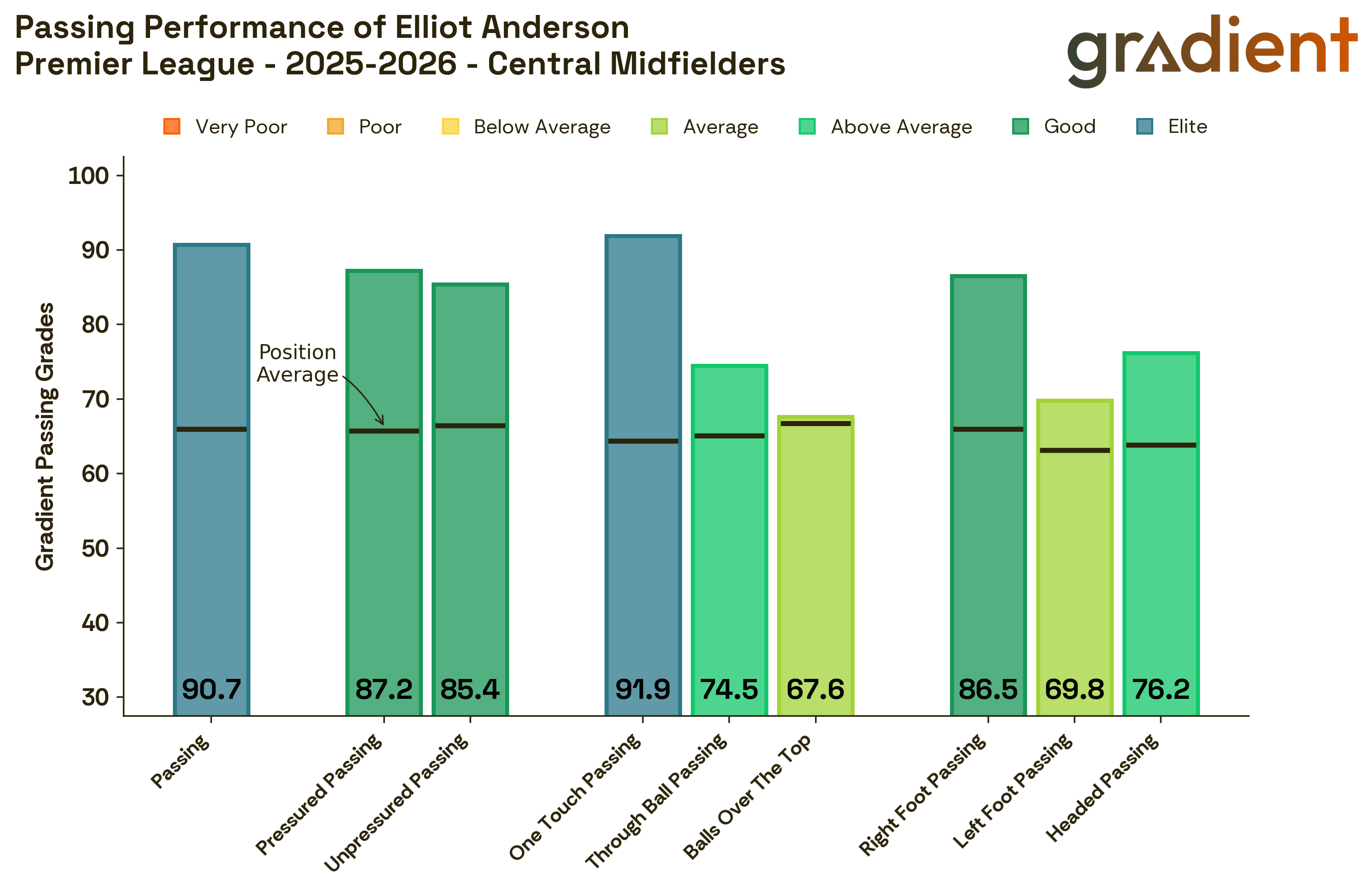 David Brooks has been Bournemouth’s most consistent performer. His 92.6 Crossing Grade ranks 2nd in the league, while his 83.7 Passing Grade and 78.9 Shooting Grade rank 8th and 13th in his position group.