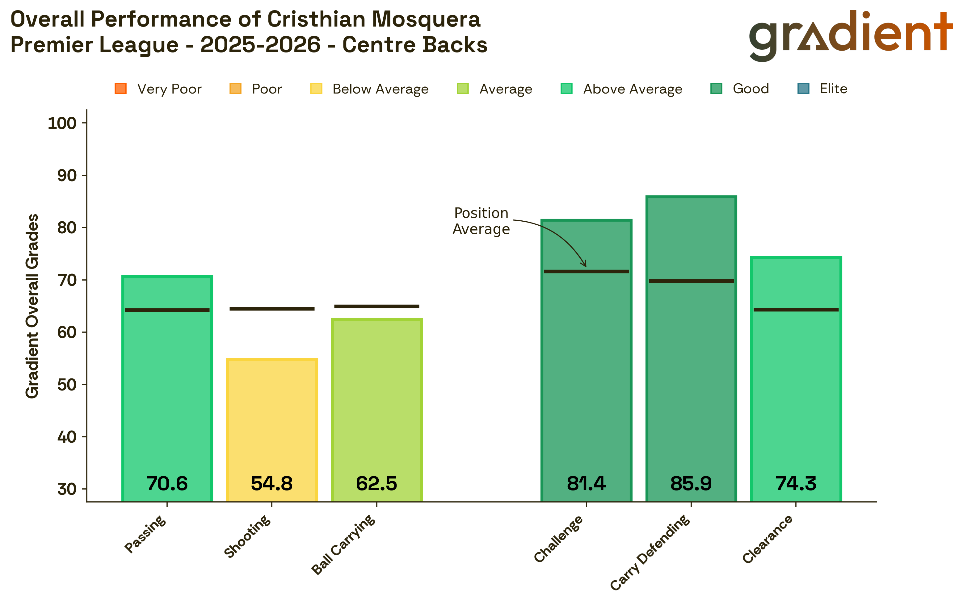He grades above average for centre backs in every key area, including an 81.4 Challenge Grade [11th of 65] and a 70.6 Passing Grade [16th of 65].