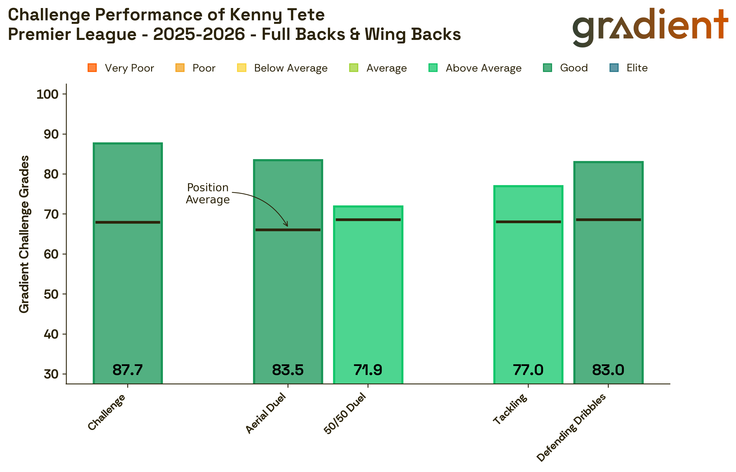 Kenny Tete’s 87.7 Challenge Grade is the highest among full backs and wing backs this season.