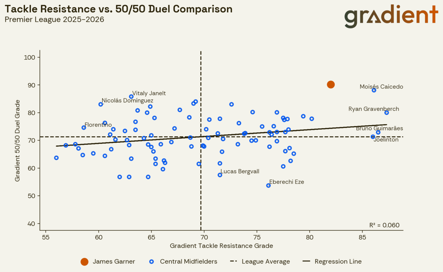 Garner also leads the way in tackle resistance grading among England-qualified midfielders with an 82.0 grade, a marked improvement on his 71.3 grade from a season ago. Only Ryan Gravenberch, Bruno Guimarães, Moisés Caicedo and Joelinton rank higher.