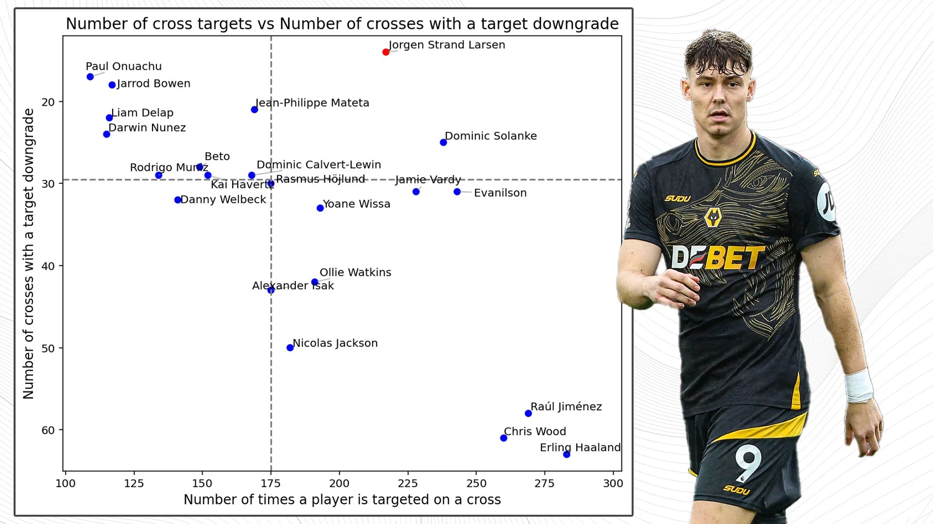 In 2024/25, Strand Larsen ranked 39th in our Top 50 Premier League players, and when analysing his performances, this is the data we found (taken from our Top 50 article last year):