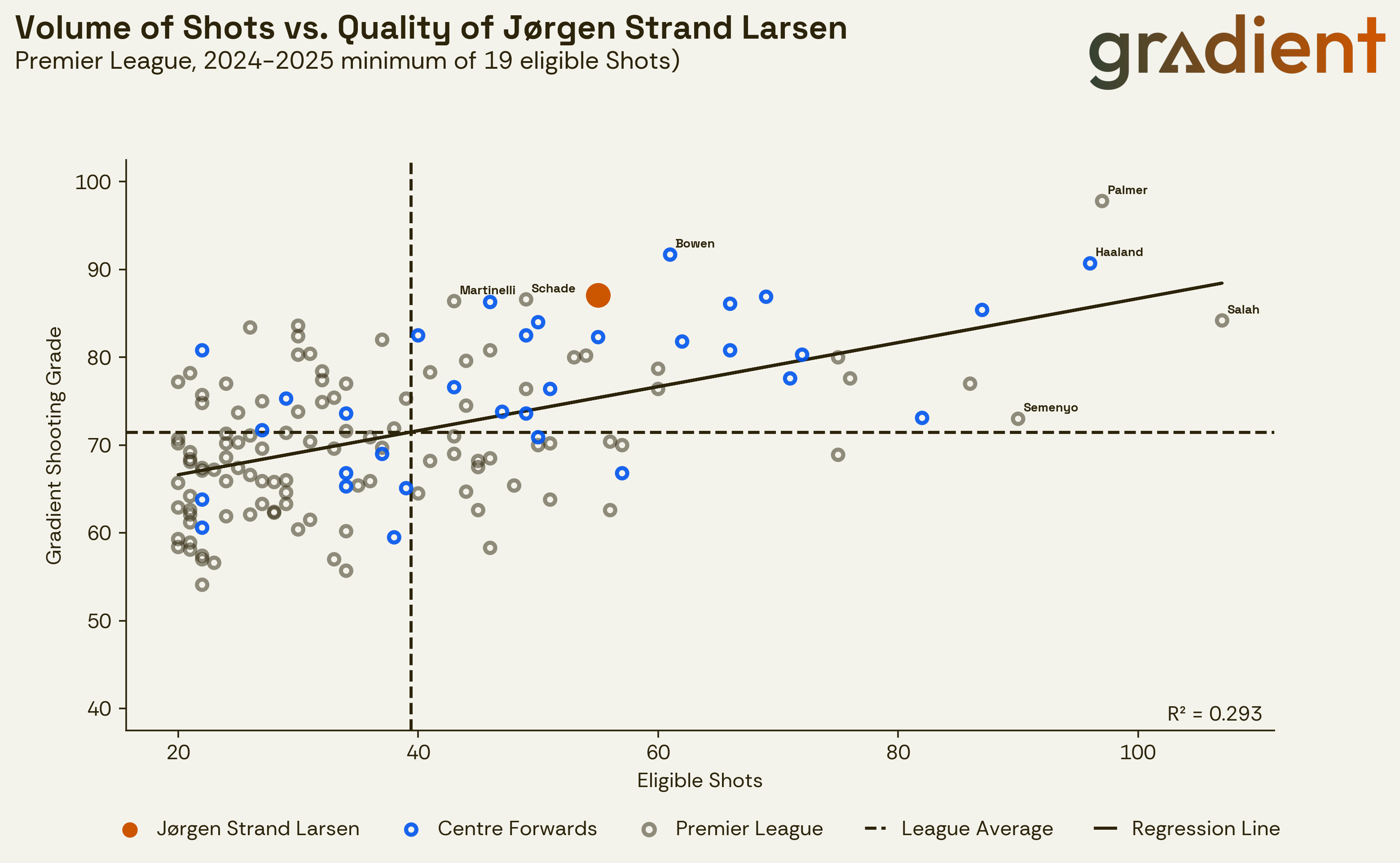 Strand Larsen’s greatest asset is a simple one: he doesn’t do a lot wrong. Whenever a player attempts to receive the ball from a cross or pass, we grade them on positioning and movement. Strand Larsen has had 217 cross targets this season and just 14 downgrades. Being at fault only 6.5% of the time, this ranks 1st among all CFs this season. His decision-making when shooting is also elite — only 5.4% of his shots had a better option available (ranking 2nd best among CFs). This is a trait elite teams value highly, especially when needing to maximise chances against low blocks.