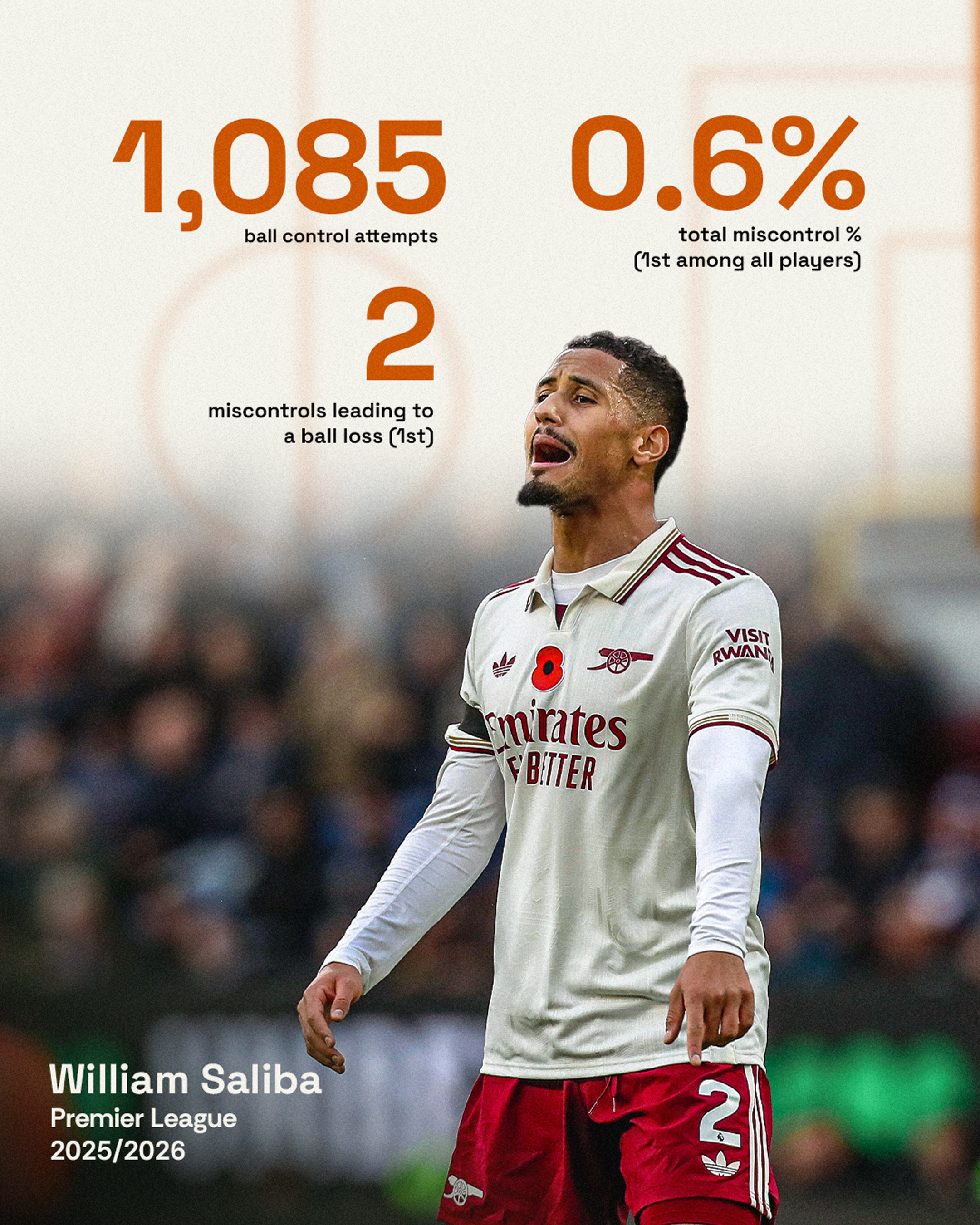 From 1,085 ball control attempts this season, William Saliba has made just one miscontrol under pressure and only two miscontrols leading to a ball loss. His 0.6% total miscontrol percentage ranks first among all outfield players in the Premier League, highlighting his composure.