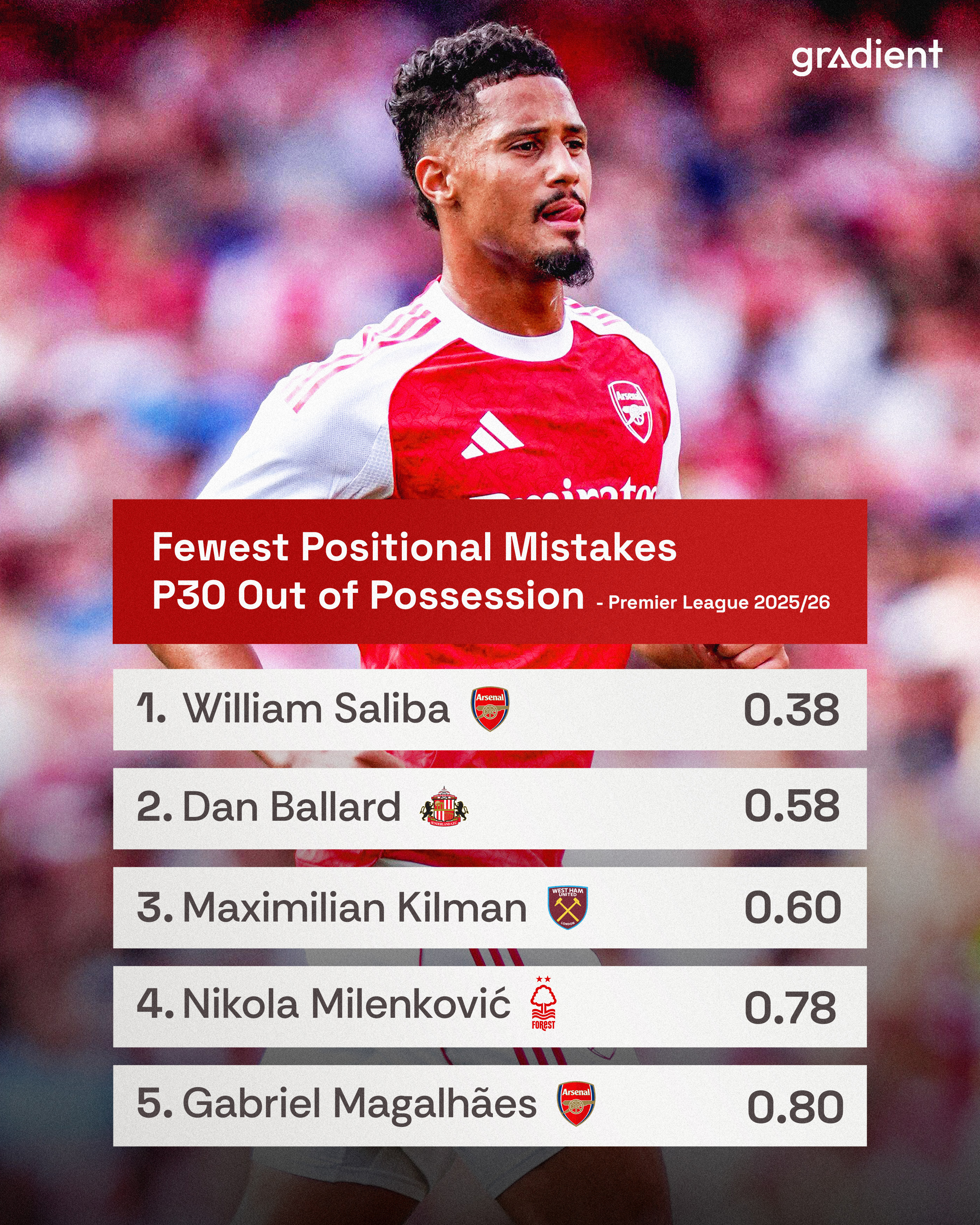In the Premier League this season, Saliba has made just 0.38 positional mistakes per 30 minutes out of possession. This ranks first among all outfield players and places him well ahead of the centre-back average of 1.27.