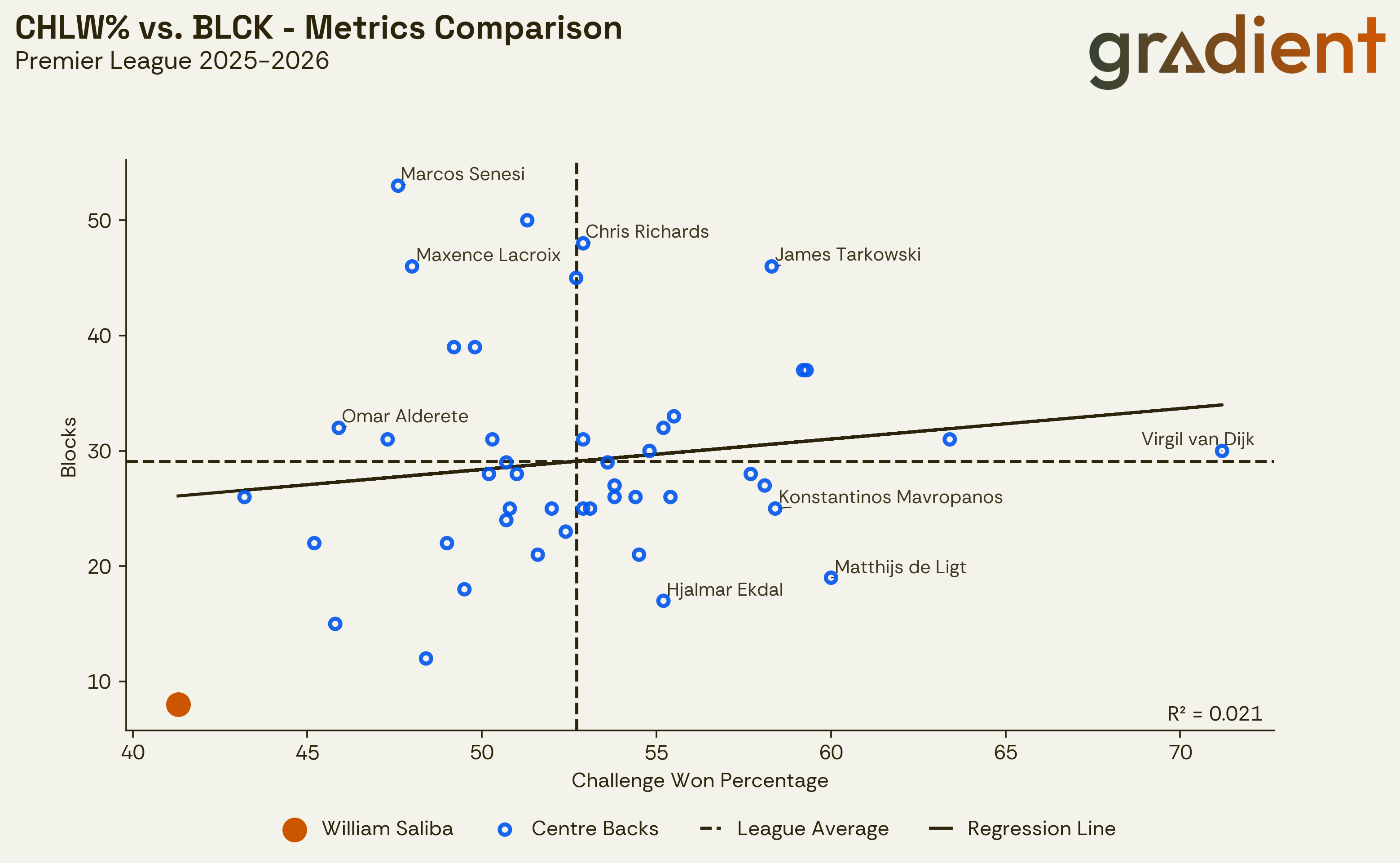 Saliba’s 2.44 block attempts per 30 minutes out of possession ranks last among centre-backs.
