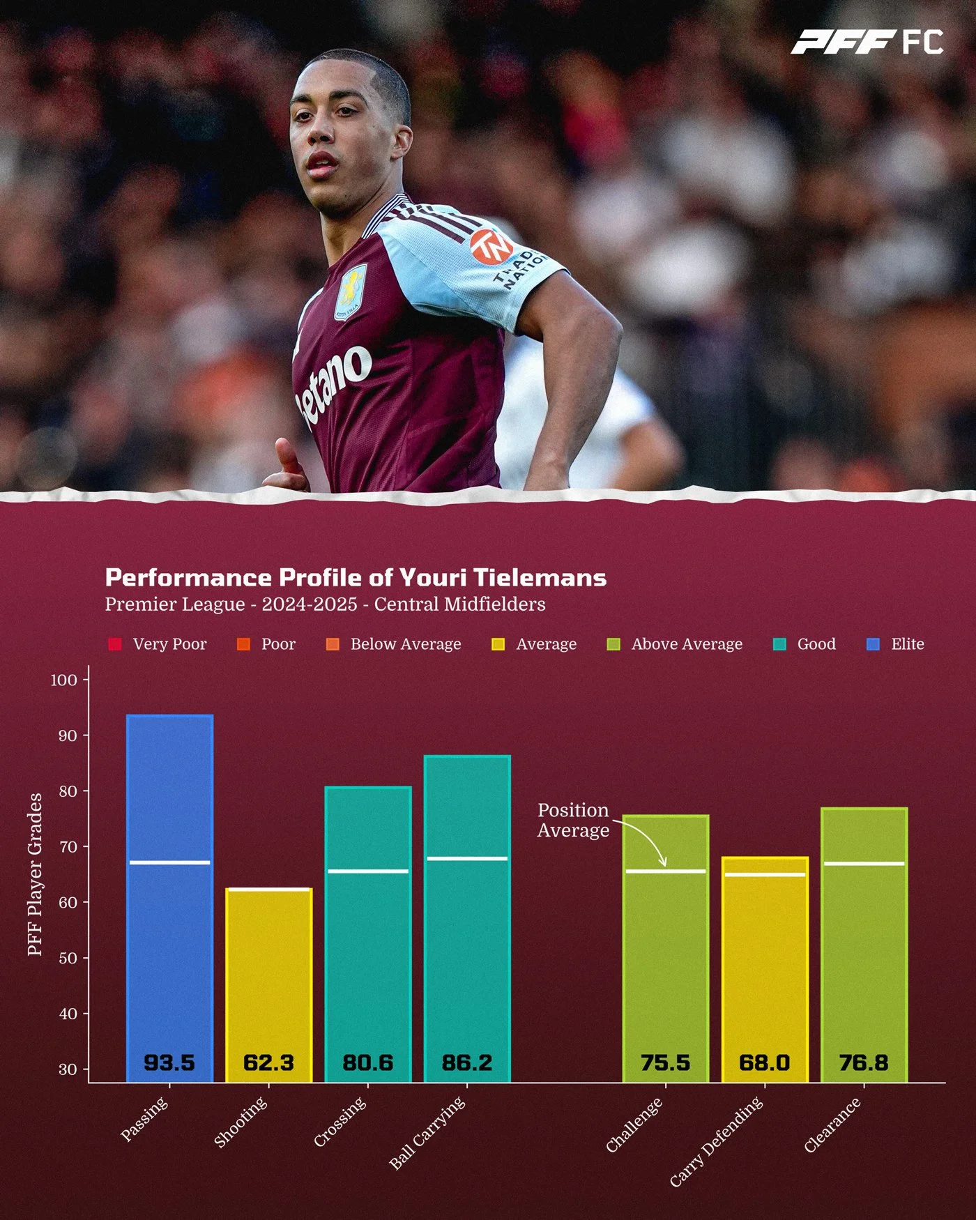 Ugarte enjoyed a very productive day in Manchester United’s clean-sheet victory over Leicester City. His passing was a clear bright spot in his performance. He completed 47 of his 52 pass attempts (90.4% accuracy), leading to a season-high 82.6 passing grade (11th among CM’s). Ugarte was also one of the strongest CMs in the Premier League this week in defence. He won 10 total challenges which was good for 3rd at the CM position, while his 77.4 tackle grade also ranked 3rd among CMs. While in possession of the ball, he was dominant, grading out with an 83.9 tackle resistance grade, another mark that placed him 3rd among CMs for the week.