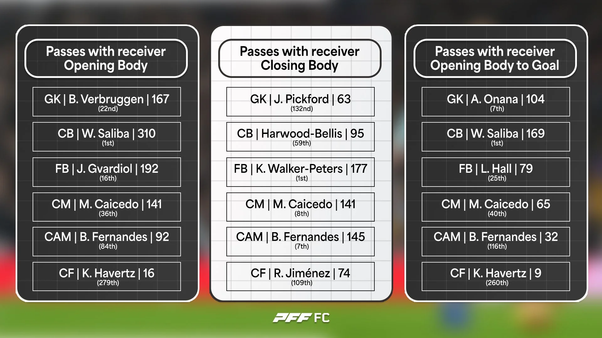As with Goalkeepers I’m pleased to see players like William Saliba, Virgil van Dijk & Levi Colwill top the list as these are players well recognised for their ability on the ball, but it is Dan Burn that I’d like to highlight. The emergence of Lewis Hall as well as Sven Botman’s absence through injury have given him the opportunity to return to his more natural position at Centre Back & he has responded with one of the best seasons of his career. Thomas Tuchel handed him his England Debut during this past International break & it’s easy to see why, always regarded as a strong defensive player (199 Challenges Won this season ranks 3rd in the Premier League) but he also profiles as an extremely detailed passer ranking clearly 1st in both Passes with Receiver Opening the Body & Opening to Goal, and third on Passes with Receiver Closing the Body at 2.49%.