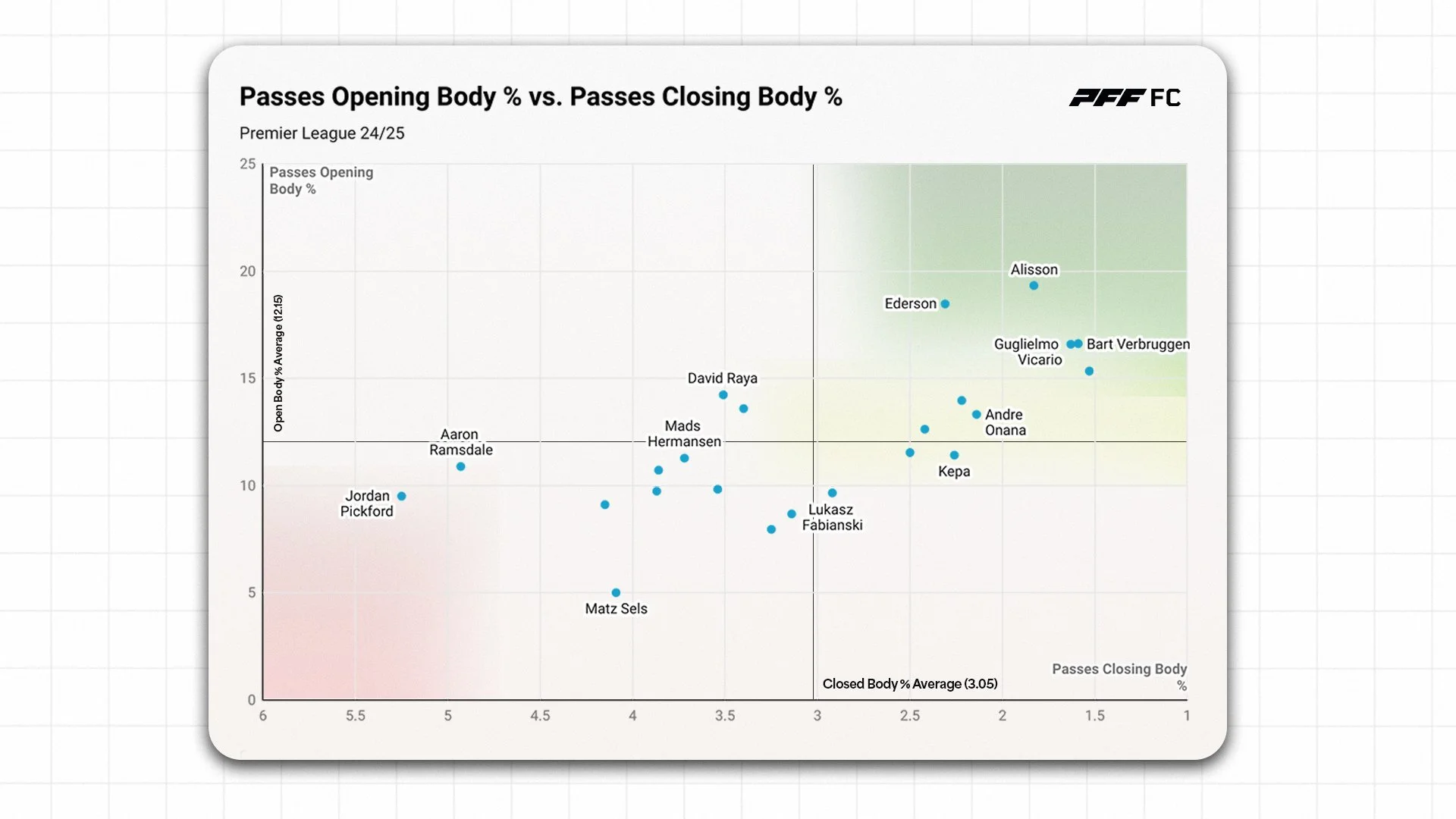It has historically been very difficult to pick out the best passing Goalkeepers from data alone so it is pleasing to see Alisson & Ederson showing up as the standouts here as they are both often recognised as the best Goalkeepers with the ball at their feet. Perhaps unsurprisingly given what we explored in the previous article regarding Tottenham’s Centre Backs, but Guglielmo Vicario also profiles well here (16.59% Passes with Receiver Opening Body, 1.63% Passes with Receiver Closing Body) & there is a clear drop off when compared to his replacements (Forster, Kinsky & Austin combined: 11.38% Passes Opening Body, 2.38% Passes Closing Body).