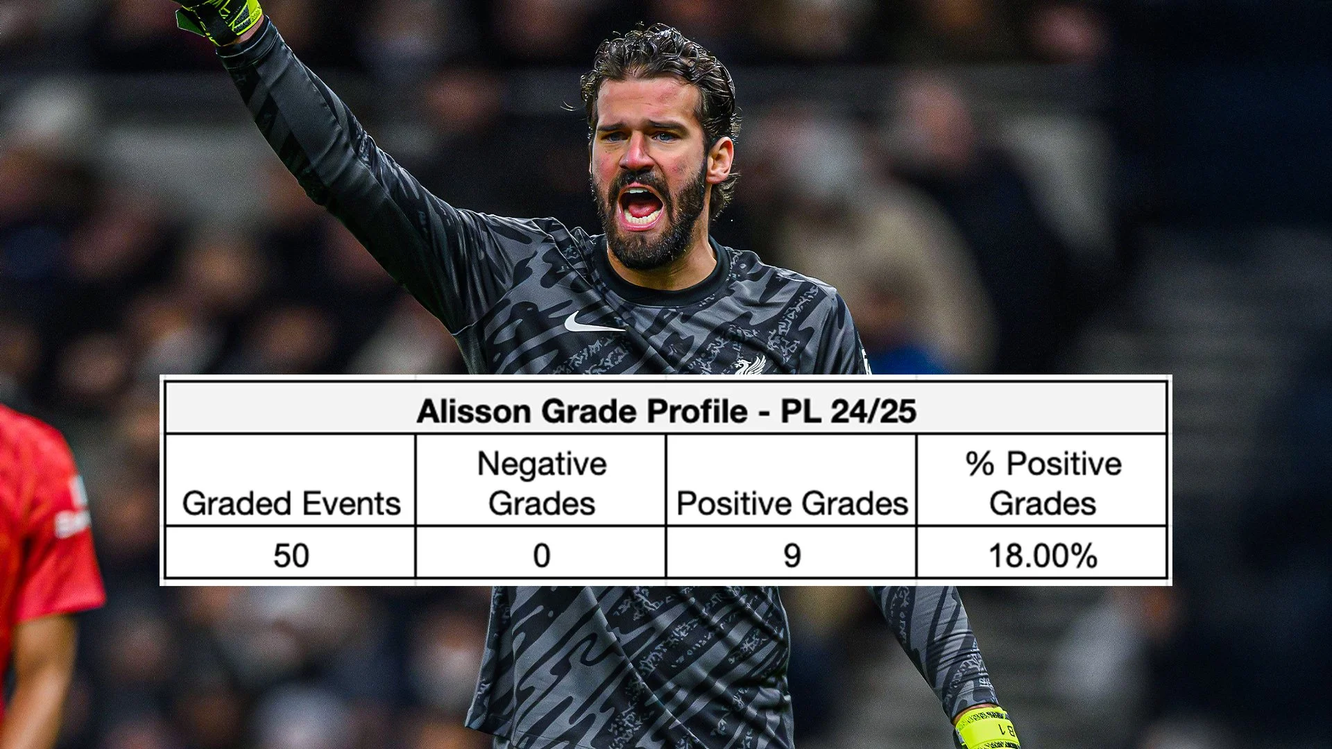 Okay, this is an interesting case, Alisson is one of just three qualifying Goalkeepers who has not received a negative grade so far this season, however he also ranks 22nd in the % of Positive grades received. So while he leads the league in Goals Conceded & Save % his grade profile suggests that a large proportion of those saves were from shots that you would expect to be saved. This correlates with our grading system that ranks average/as expected performance in the 60-70 range, with Alisson’s shot-stopping grade this season being 69.3.