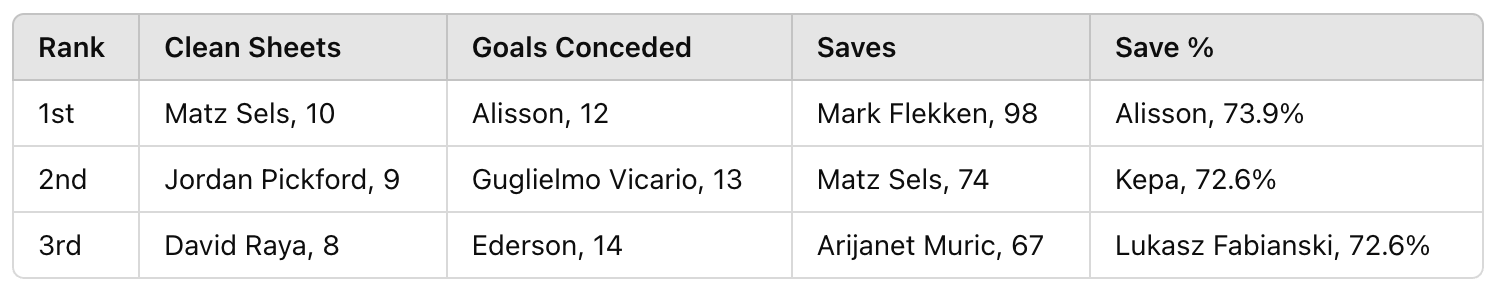 Goalkeeping has long been an area that has been poorly represented with traditional data, things like Clean Sheets & Goals Conceded are better measures of team quality than a goalkeeper's individual performance. Saves are also influenced by team quality, the more shots you face the more opportunities you have to make a save, Save % goes some way to normalise that but lacks context around the quality of the shot. Looking at those more traditional metrics below throws up 10 different names out of a possible 12 when looking at the top performers this season. That in itself proves the point that these probably aren’t the best predictors of performance.