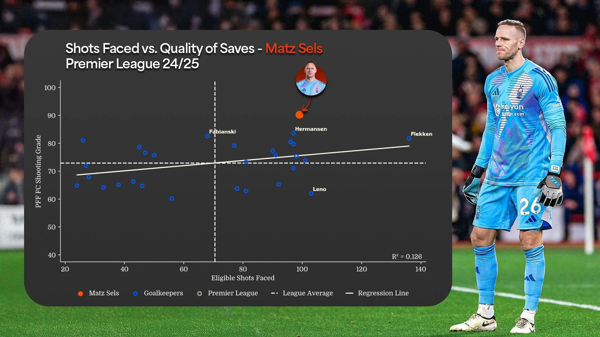 After a quick dip in form towards the end of the year, Forest have regained their composure and won 7 of their last 8 in the Premier League, their only dropped points coming against leaders Liverpool. As the two-time European champions start dreaming about a return to the continent for the first time since a 1996 UEFA Cup quarter-final against Bayern Munich, they have a number of players who have contributed to this incredible run. Ola Aina and Nikola Milenkovic have been resolute in defence, while Chris Wood has a 91.4 shooting grade which is only behind Cole Palmer’s 99.5. Then their attacking midfield trio of Callum Hudson-Odoi, Morgan Gibbs-White and Anthony Elanga have created 95 chances between them this season. However, Forest’s standout player has been goalkeeper Matz Sels.