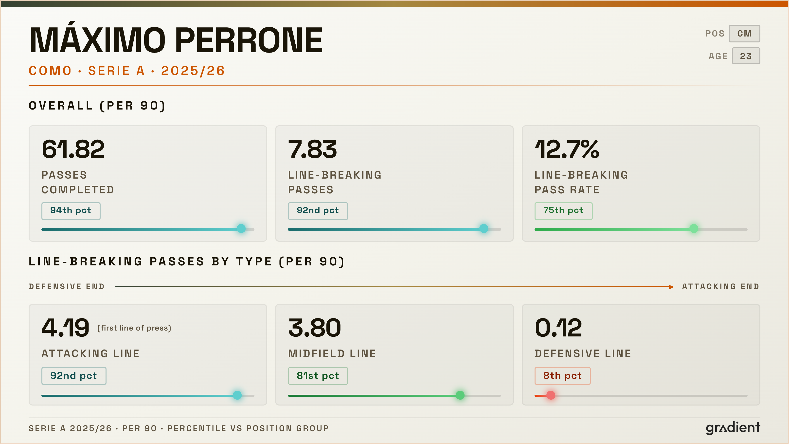 Perrone has been Fàbregas’ preferred option to start in midfield over Maxence Caqueret and the two share a surprisingly similar grading and production profile.