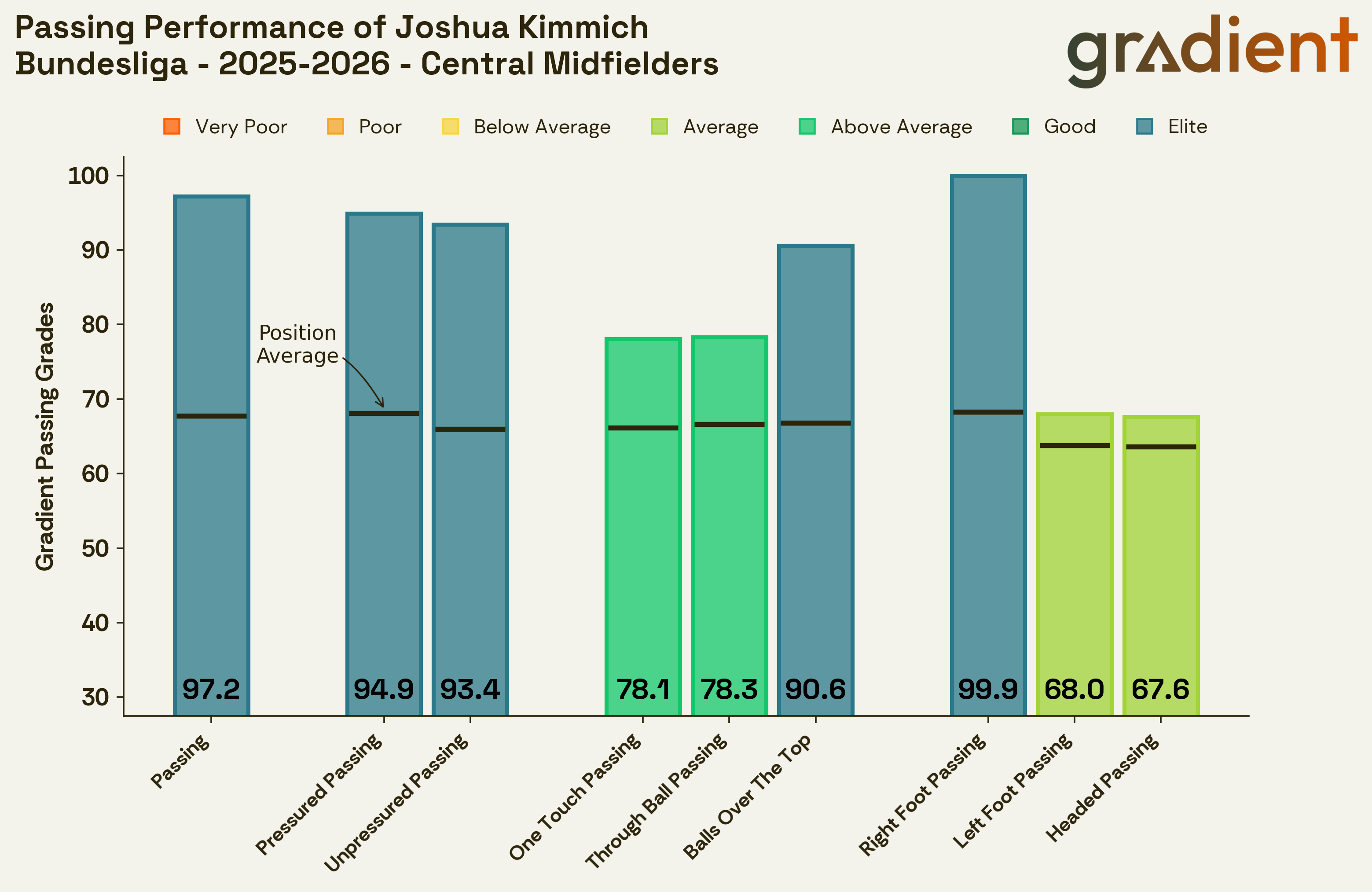 Kimmich has succeeded across all types of passing, completing 15/15 switch passes (1st), nine balls over the top (2nd), and eight through balls (9th).