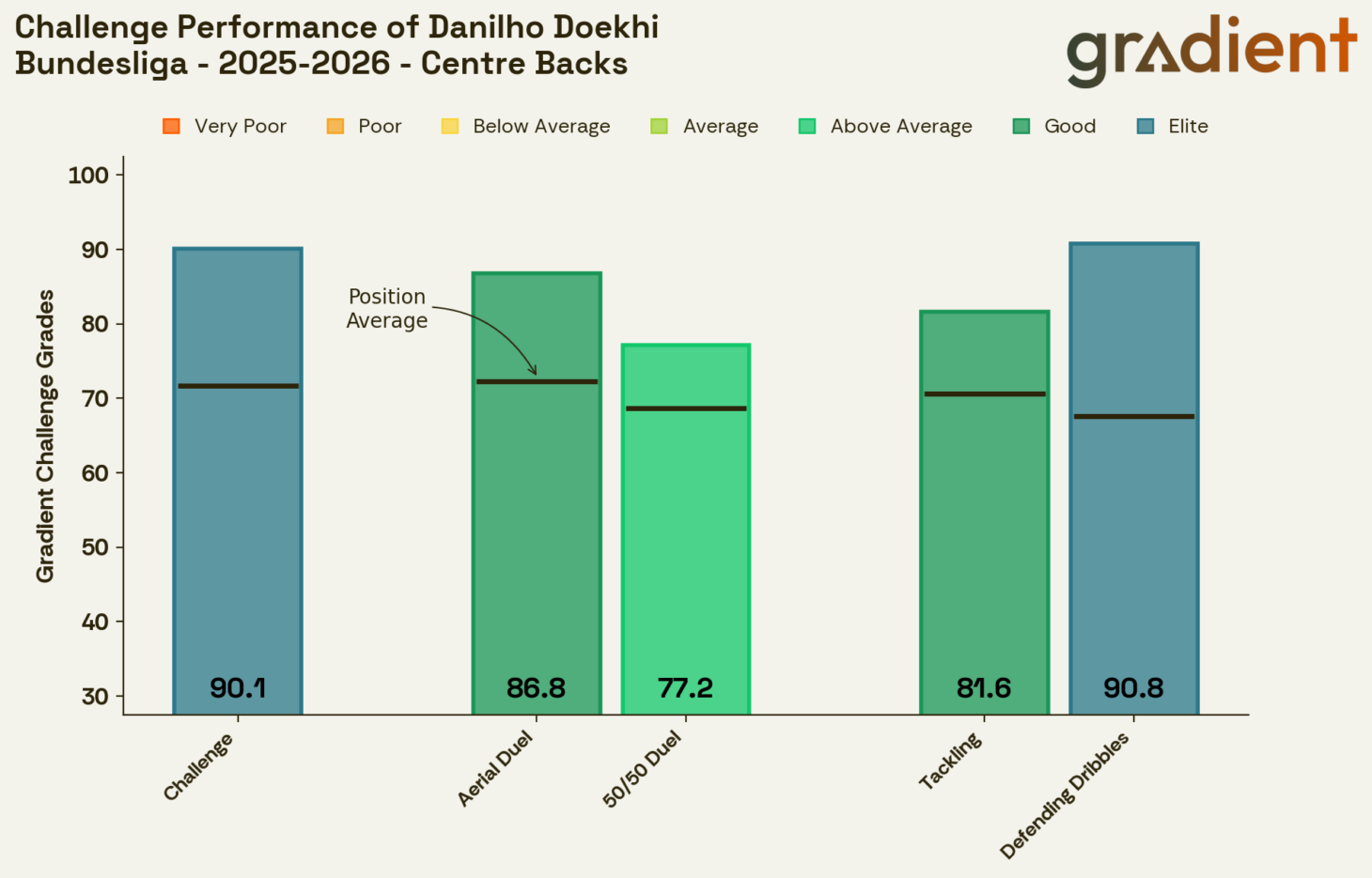 Daniel Doekhi leads the Bundesliga with a 90.1 Challenge Grade, excelling in both Aerial Duels (86.8) and Defending Dribbles (90.8). The FC Union Berlin defender has won 26 of 41 aerial duels this season, with 21 of those graded above expectation. Three of those received +1.0 grades, including a vital headed clearance against Eintracht Frankfurt in the 99th minute.