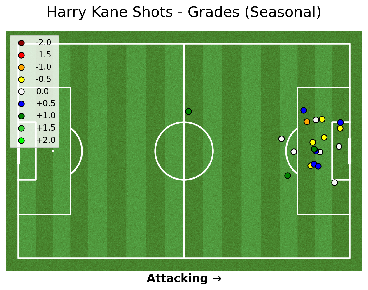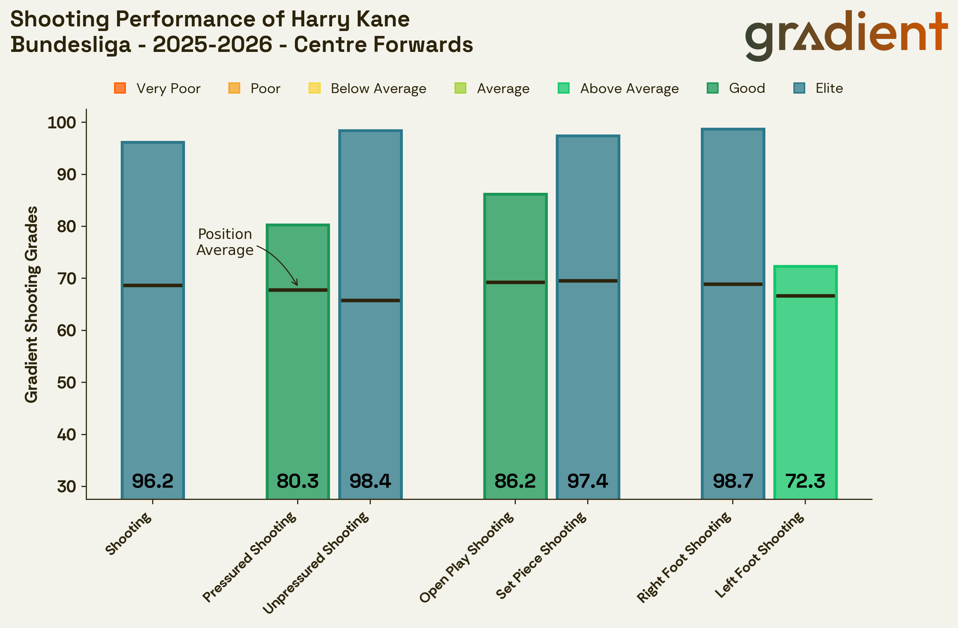 Harry Kane has been at his dominant best recording a 96.2 Shooting Grade. An incredible 38.1% of his shots this season have been deemed “unsaveable” by the goalkeeper. To put that into perspective, the next-highest mark across Europe’s top five leagues from a player with 15 or more shots is 25% (Serhou Guirassy).
