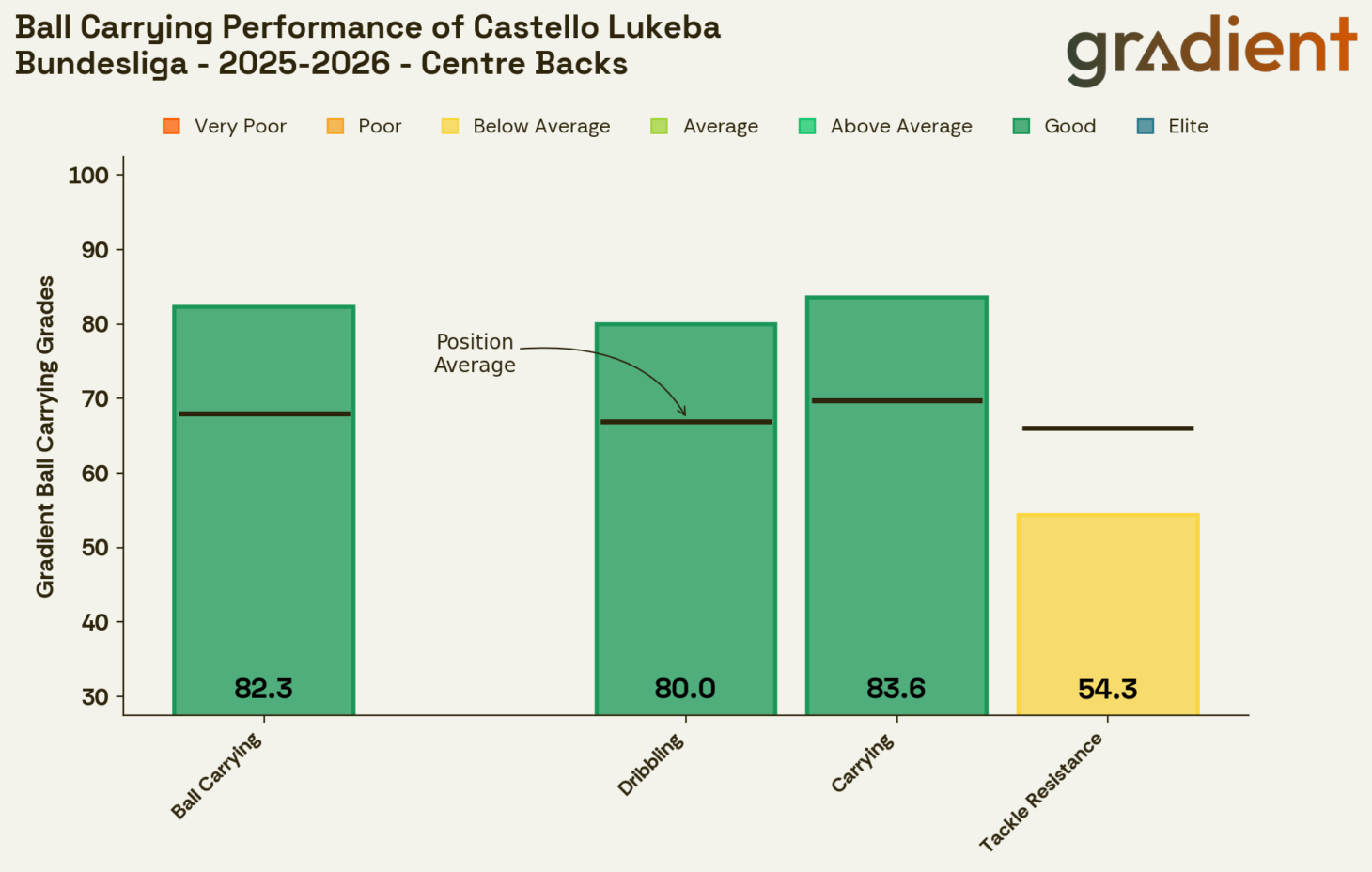 Remarkably, of his 22 total ball carries, 18 have been successful, with 15 earning a positive grade (68.2%). Among players with 15 or more carries this season, the next-highest percentage of positively graded carries belongs to Luis Díaz (54.3%), highlighting Lukeba’s outstanding decision-making and execution.