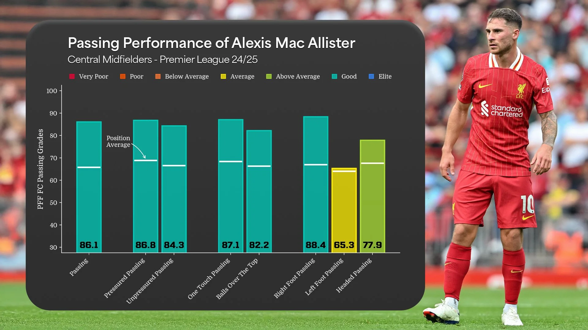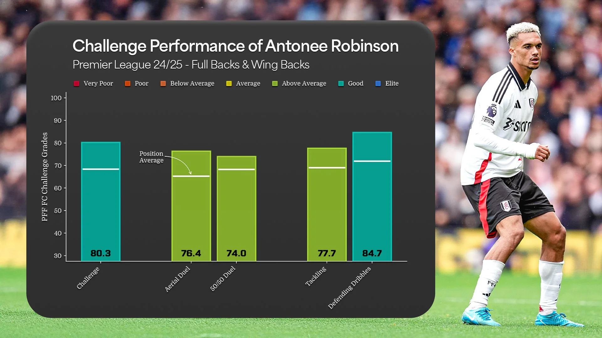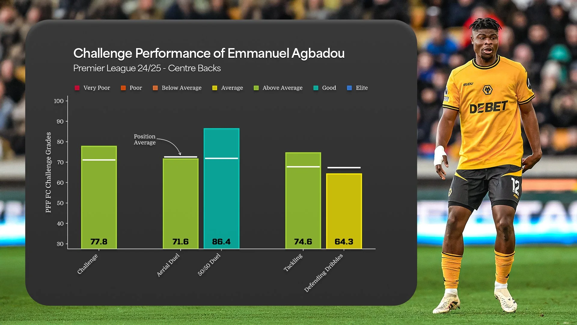He recorded a 70+ grade in six different categories, peaking with an 87.8 Challenge Grade (4th highest in the Premier League).