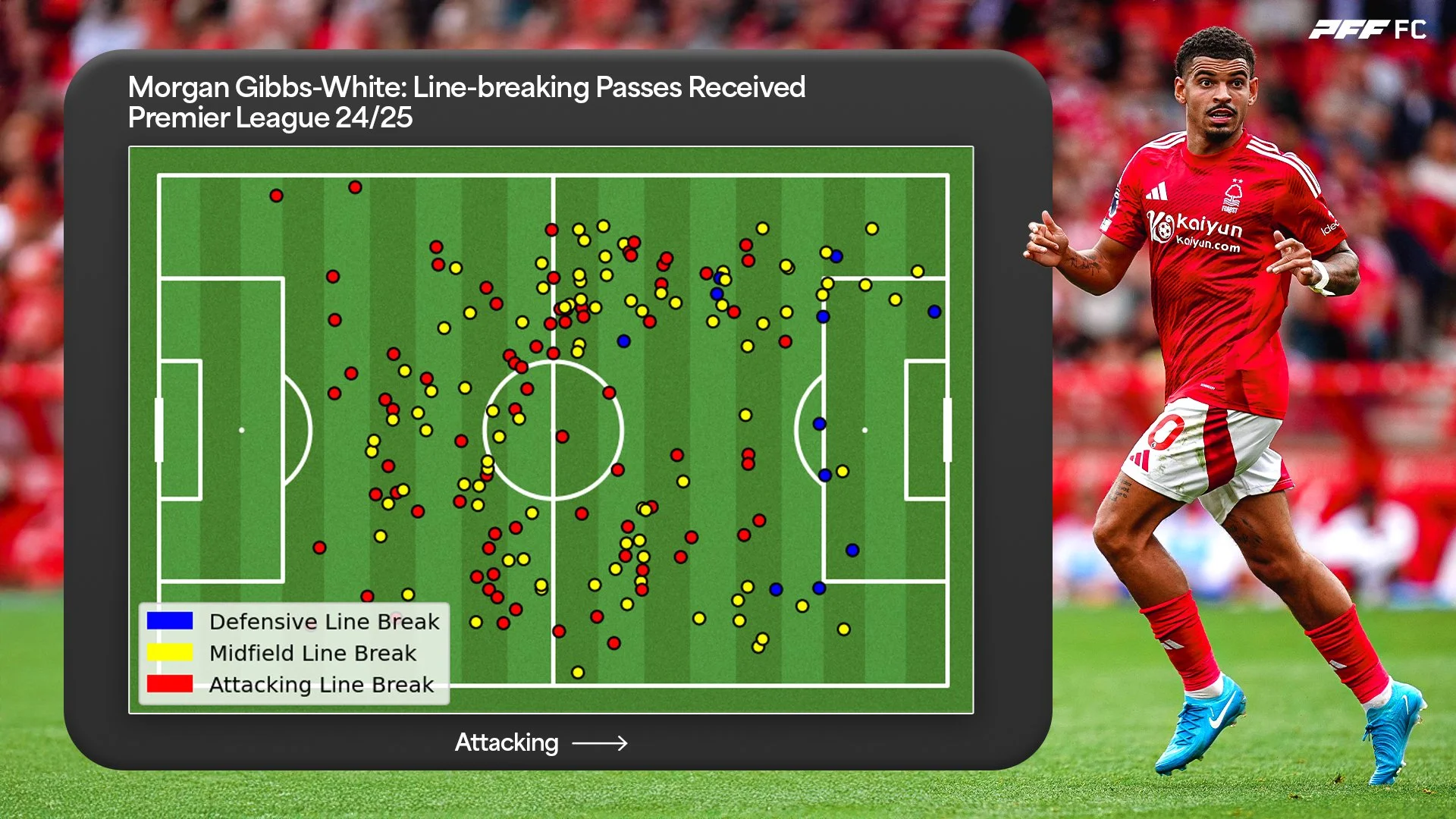 He posted a 92.4 Passing Grade, fourth among all players, and a 98.3 Pressured Passing Grade, second overall. Of his passes, 87% went forward or laterally, showing his progressive intent. He led the league in line-breaking passes with 319, including 181 that broke the midfield line.