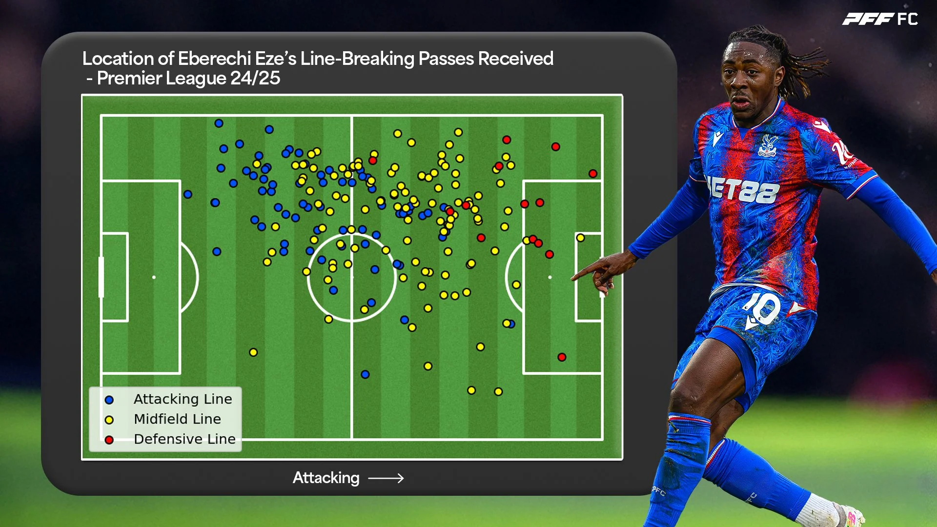 Transitionally, Eze was central to Palace’s build-up. He received 197 line-breaking passes, accounting for 21.0% of all his receptions — a clear indicator of how often he was targeted to drive progression, often on the receiving end of an Adam Wharton line-breaking pass.