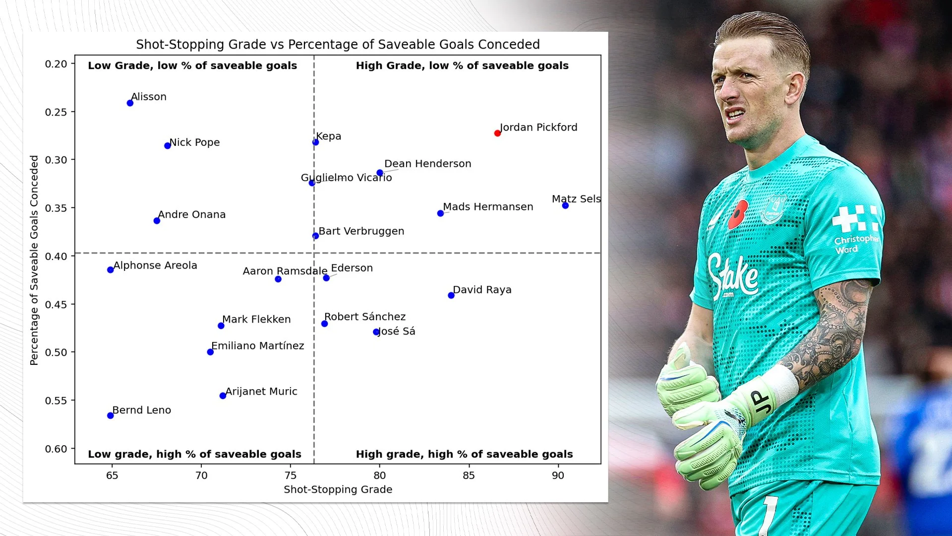 Jordan Pickford delivered a complete goalkeeping performance in the Premier League this season, combining elite shot-stopping with strong contributions in distribution and command of the box.