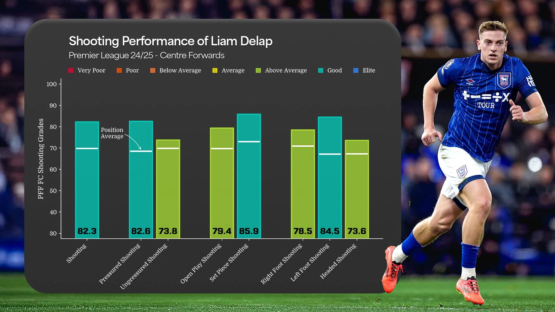 This translated into a shooting grade of 86.1, 3rd among centre forwards with 60+ shots. His aerial threat was particularly notable, with a headed shooting grade of 88.4, 2nd among centre forwards.