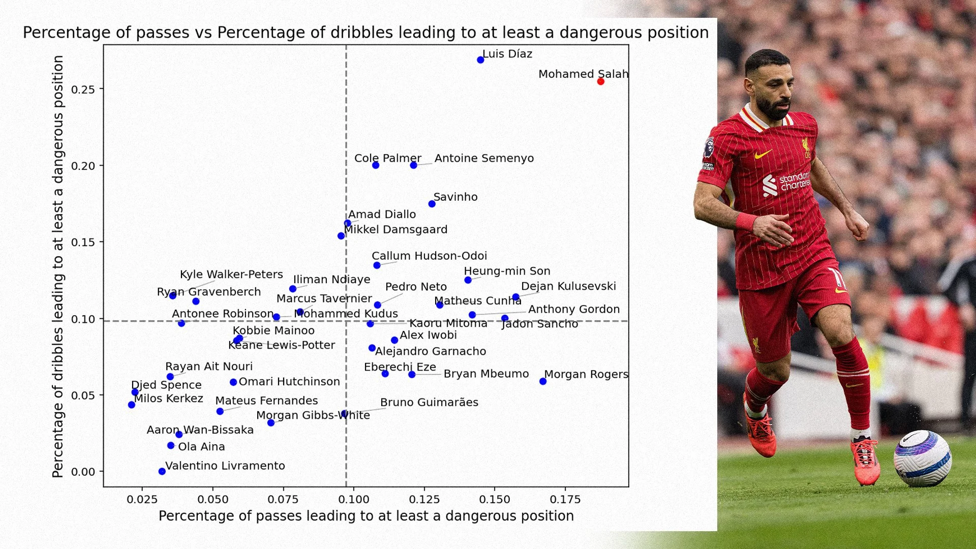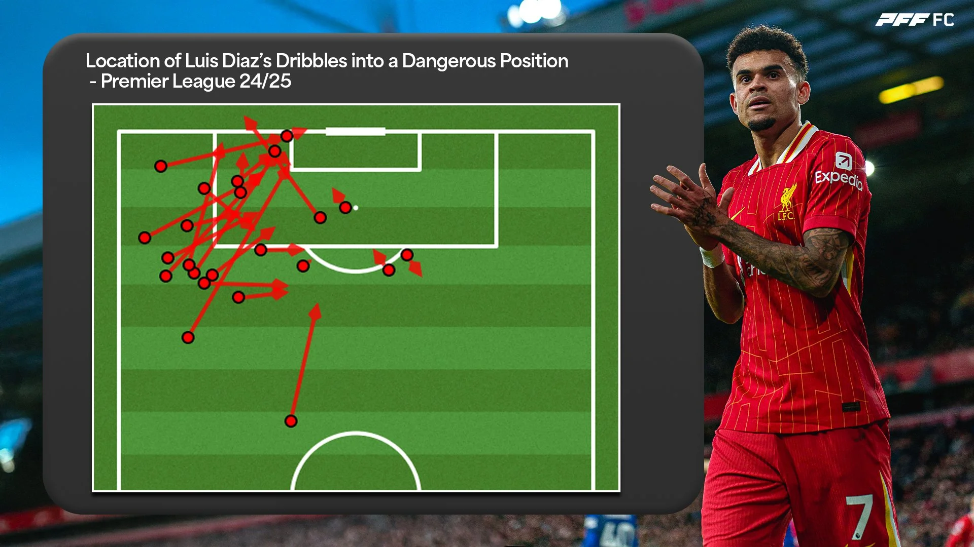 Díaz's dribbling prowess, long recognized as one of his standout traits, remained exceptional this season. His 85.9 Dribbling Grade ranked him fifth among players in his position. When delving into the stats that dictate this grade there are a number of really impressive aspects. Firstly, he completed 47 dribbles, the eighth-most in the league, with seven of those breaking a line, placing him sixth in that metric. He also made 25 dribbles that led him into a dangerous position, a figure surpassed only by Jérémy Doku and teammate Mohamed Salah. Also Impressively, 26.9% of his dribbles resulted in entry into a dangerous area, the second highest rate in the league, behind only Bukayo Saka (minimum 15 dribbles).