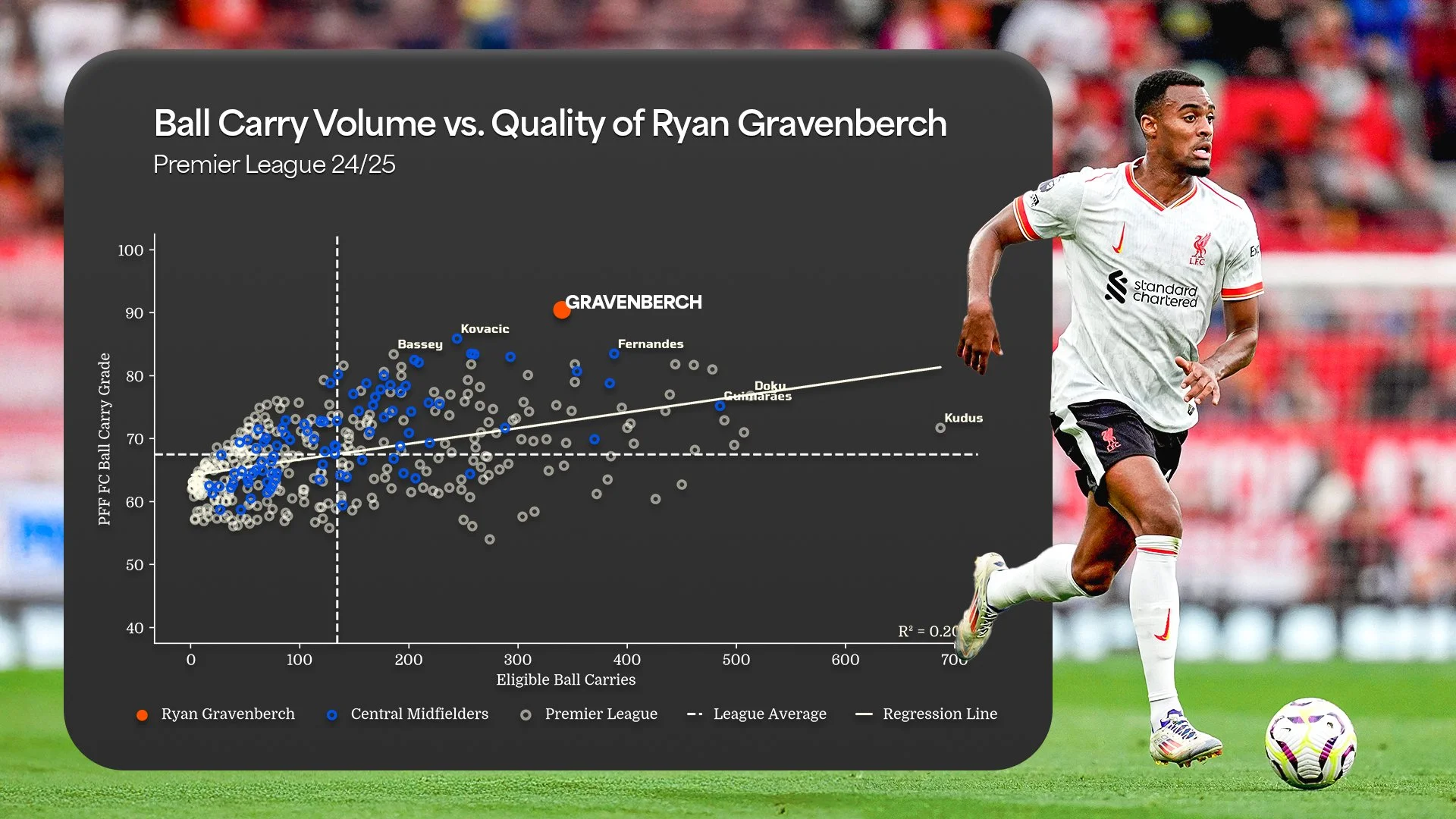 Statistically, Kovacic’s contributions were among the league’s elite. His 86.0 Passing Grade ranked 5th among all central midfielders and 2nd within the City squad. He excelled in transition play, leading the entire league in line-breaking ball carries (40) and topping the City ranks with 251 line-breaking passes, a clear indicator of his intent to disrupt opposition shape and push play forward.