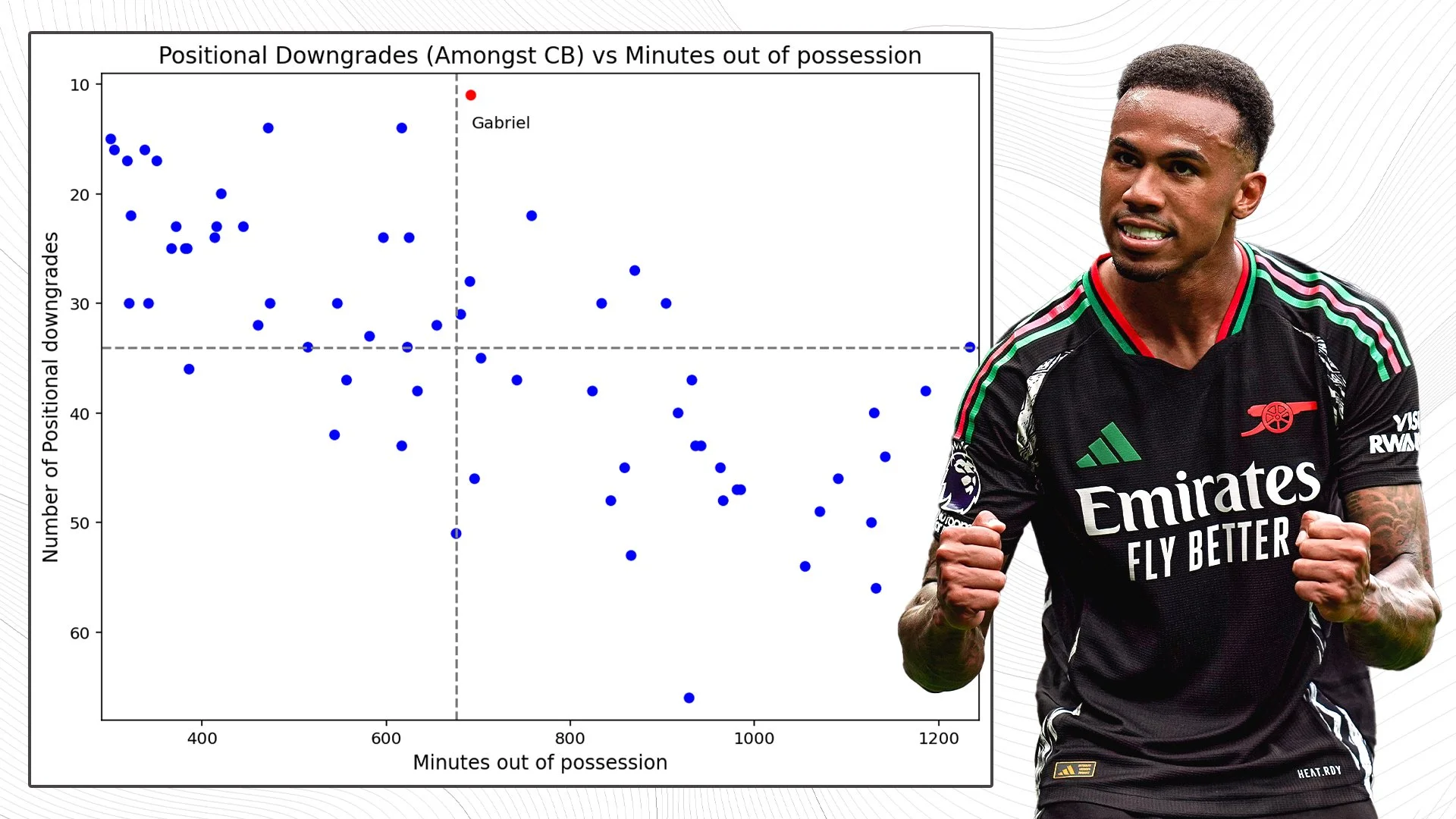 His greatest strength, and this may come as a surprise to those who first watched him in an Arsenal shirt, is his positioning. Under Mikel Arteta, Gabriel has matured into the vocal leader of the defensive system, often organising their out of possession shape. No centre-back in the Premier League this season made fewer positional mistakes than Gabriel, and that’s even adjusted for time out of possession.
