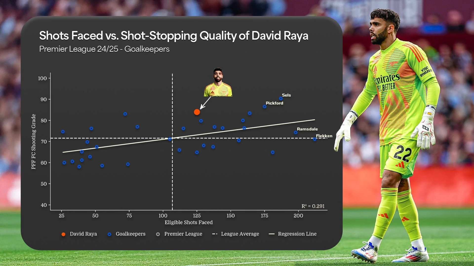His 86.6 Shot-Stopping Grade ranked 2nd among all goalkeepers, registering 37 saves above expectation (3rd most in the league) and only 27.3% of his goals conceded were registered as “saveable” goals, also 3rd best among Premier League keepers. Out of 175 shot-stopping events, just three resulted in negative downgrades, and none were categorized as major errors, underscoring his reliability under pressure.