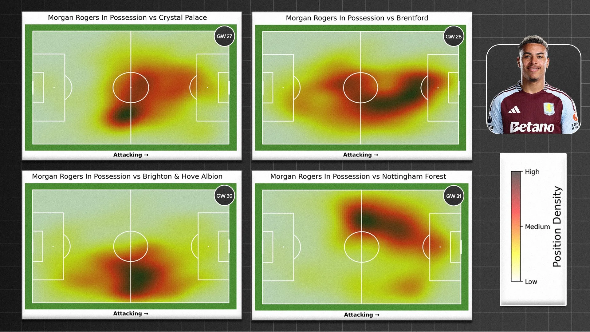 A key component of his value is his positional versatility. Throughout the season Rogers featured in four different positions— which can be highlighted from Gameweek 27-31. That flexibility made him especially valuable during a congested Top 6 schedule, giving Villa tactical adaptability across multiple match scenarios.