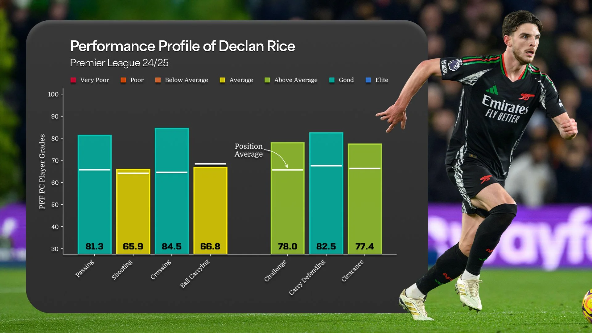 After Kai Havertz’s injury, Rice operated further up the pitch. He responded with 62 chances created, second among central midfielders, while also contributing 4 second assists and 3 third assists. He was one of just ten Premier League players to record a grade of 70 or higher in seven different performance categories, a testament to his all-around influence.