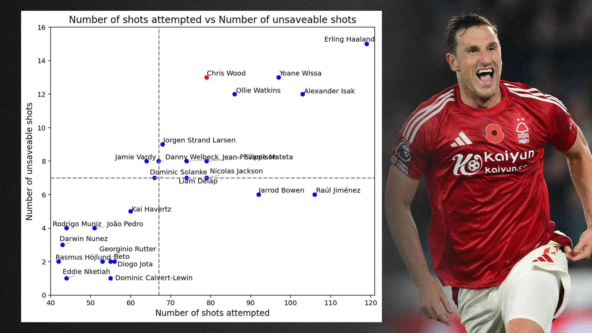 Of course when talking about Chris Wood’s 24/25 season you have to talk about his incredible performance in front of goal. He finished tied 4th in the league with 20 goals and converted all three of his penalties. But it’s the quality of his finishing that stands out, 13 of his 20 goals were deemed “unsaveable” by our analysts giving him a rate of 19.1 unsaveable goals per 100 shots. This is number one in the league among players with 30+ shot attempts.