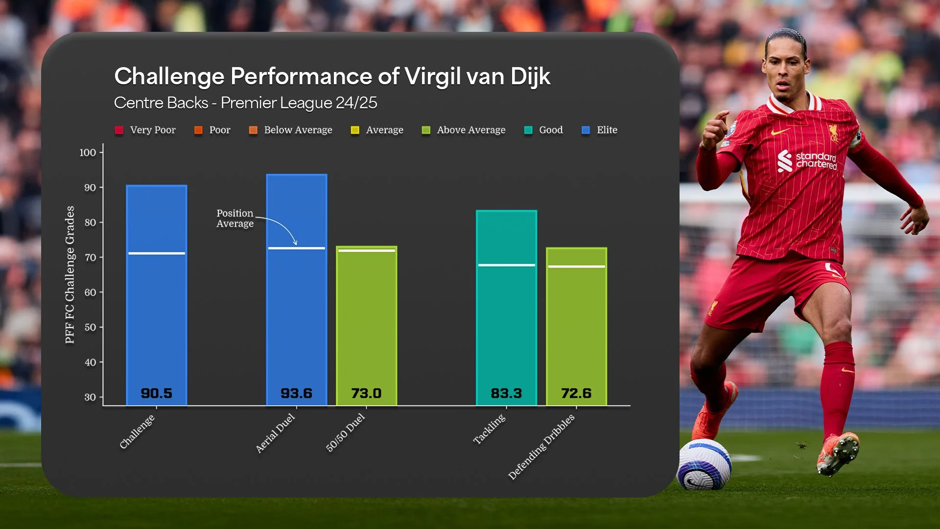 Van Dijk stood out as one of just six players to register an 80 or higher grade in four plus grading categories, showcasing both his defensive prowess and his ball-playing quality.