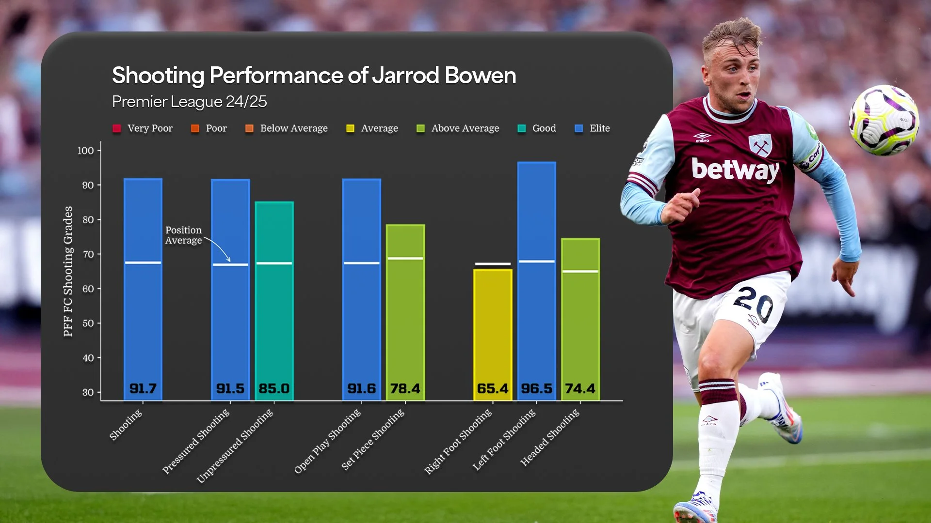 Jarrod Bowen showed quality as a shooter, passer and crosser this season. Bowen’s Shooting Grade (91.7) ranked 2nd among all players and his Pressured Shooting Grade (91.5) ranked 1st among all players, scoring 13 goals with 37 shots on target (10th overall). 17.4% of his shots were positively graded and 34.8% of his shots were negatively graded, ranking 7th best and 2nd lowest among WAM’s.