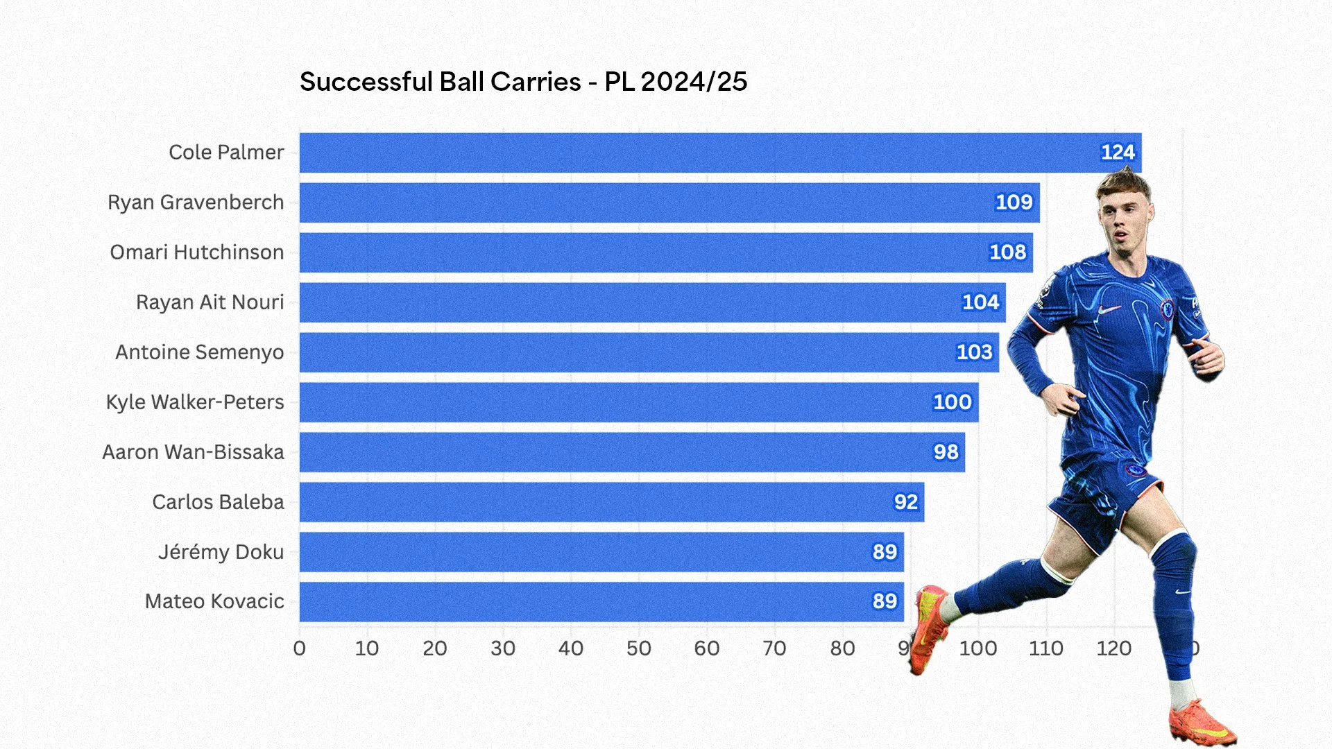 Palmer was just one of three players in the 2024/25 Premier League season to record a 75+ grade in passing, crossing and shooting.