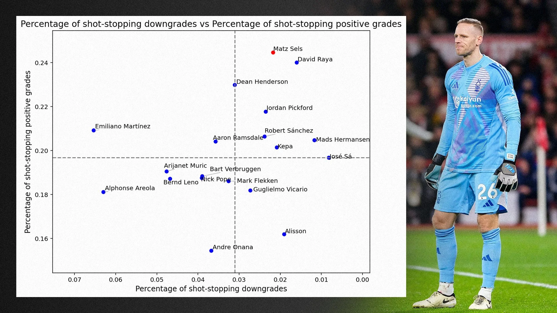 Sels faced the 3rd highest number of shots this season and only had 4 negatively graded save attempts. He didn’t have a negatively graded attempt in open play until matchday 30, which was a large reason why Forest stayed in the conversation for the Champions League until late in the season.