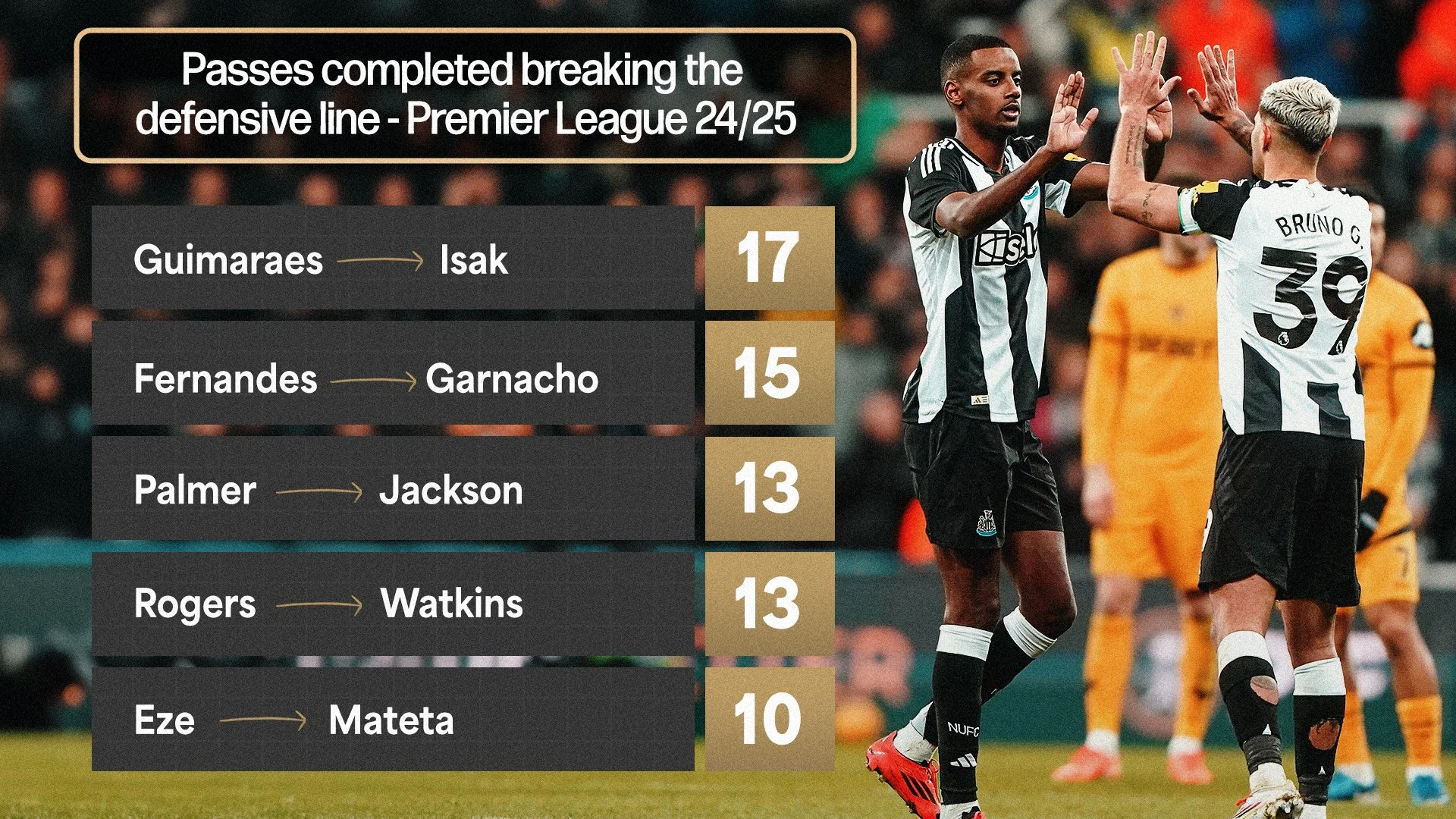 Off the ball, Isak’s movement and positional awareness made him a constant outlet for Newcastle. He received 234 line-breaking passes, the most of any centre-forward in the league, frequently offering himself between or behind defensive lines. Once on the ball, he remained composed and goal-oriented. A standout 8.1% of his total receptions came with his body already open to goal, ranking third among players in his position. This ability to control and transition quickly into goal-facing actions gave Newcastle a clear edge in attacking phases.
