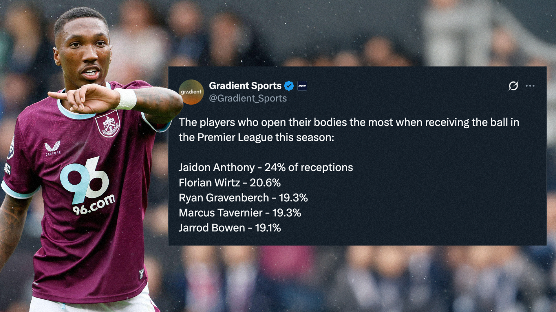 One of Anthony’s key strengths is how he receives possession. At Gradient Sports we track body orientation at the moment a pass is played and at the moment it is received. This allows us to measure whether a player opens or closes their body upon receiving the ball, excluding inaccurate passes that force unintended adjustments.
