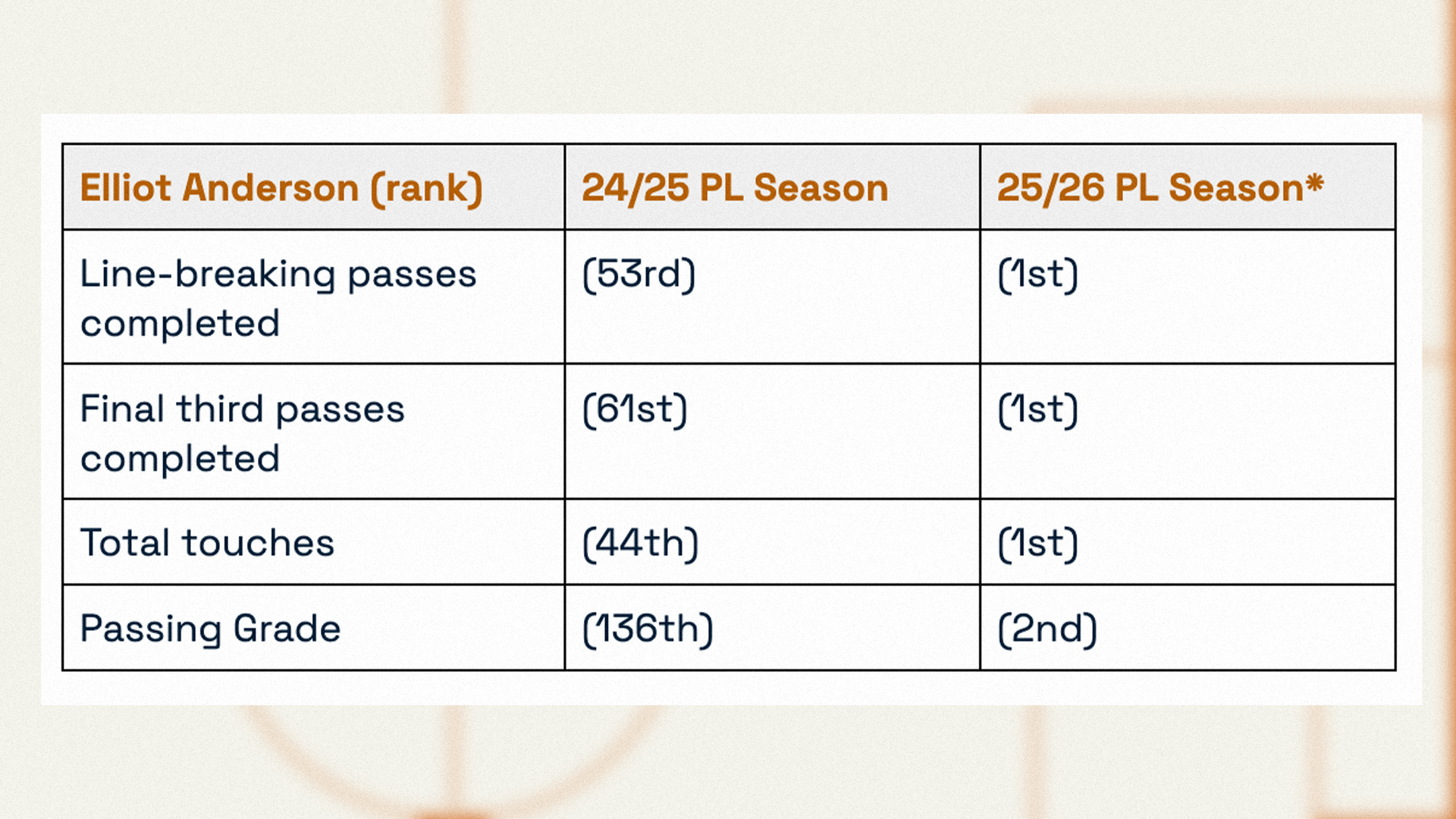 Anderson leads the Premier League in line-breaking passes completed [59], final-third passes completed [116], and total possessions [567] — outstanding numbers for a player outside the ‘big six’. He has also registered 1,556 touches, 37% more than the next-highest player, highlighting the extent to which Forest’s play flows through him.