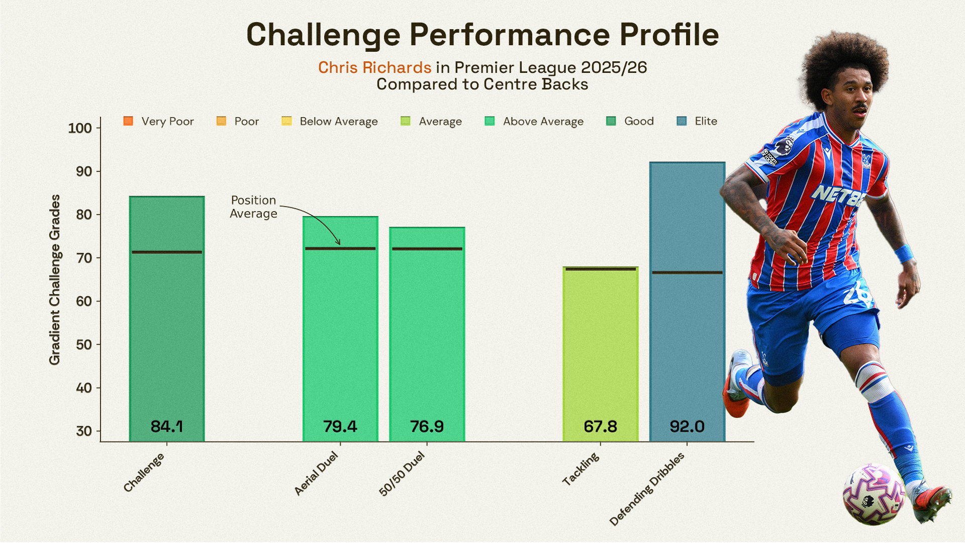 This season Richards has made just 0.45 positional mistakes per 30 minutes out of possession, the second-best rate among all centre-backs. He also leads the league in defending dribbles with a 94.9 grade, winning 10 of the 13 dribbles he has faced. Richards’ 86.7 Challenge Grade ranks 3rd among centre-backs, underlining his dominant form.