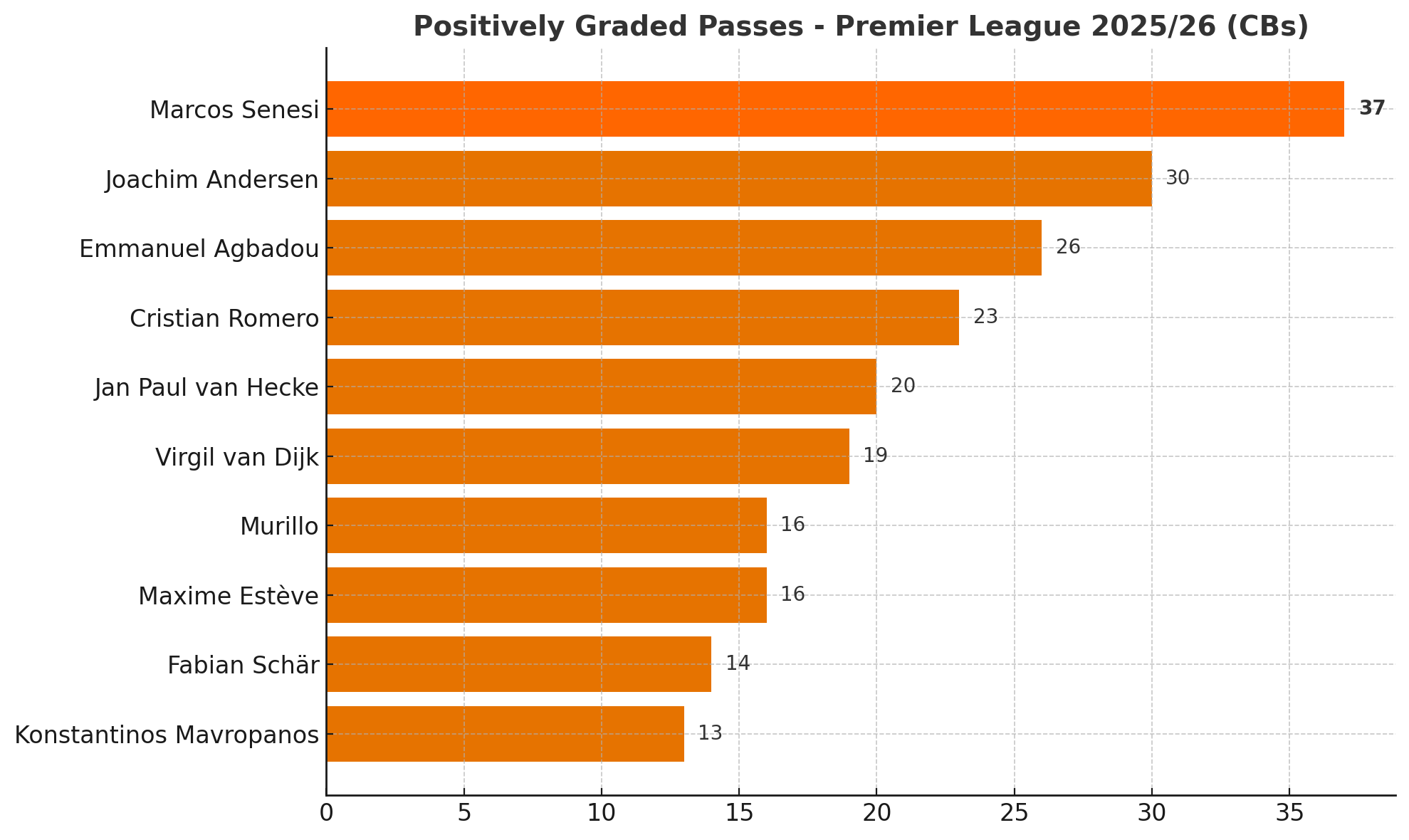 Senesi has taken on Huijsen’s former role of sparking Bournemouth’s attacks from the back. Among centre-backs he ranks 1st in passes into dangerous areas [15], positively graded passes [37], and completed passes over the top [17] — 9 more than the next-best player, Emmanuel Agbadou. He also records the longest average pass distance of any centre-back with 300+ minutes played [21.34 metres], reflecting his willingness to launch counterattacks in Iraola’s high-intensity system.