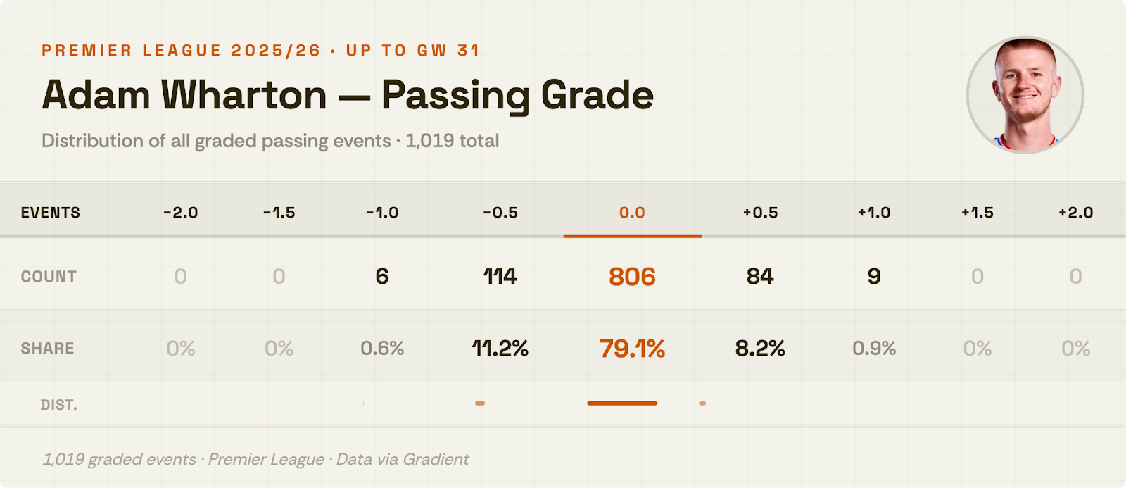For example, consider a centre-back passing the ball on the halfway line. A routine, unpressured pass to an open teammate would receive a 0, as this meets the expectation of our expert Grading team. A precise, line-breaking pass under pressure would receive a positive grade. Conversely, an underhit pass to a teammate - even if completed - would receive a negative grade if it falls below the expected standard. This reflects our focus on evaluating performance rather than just outcomes.