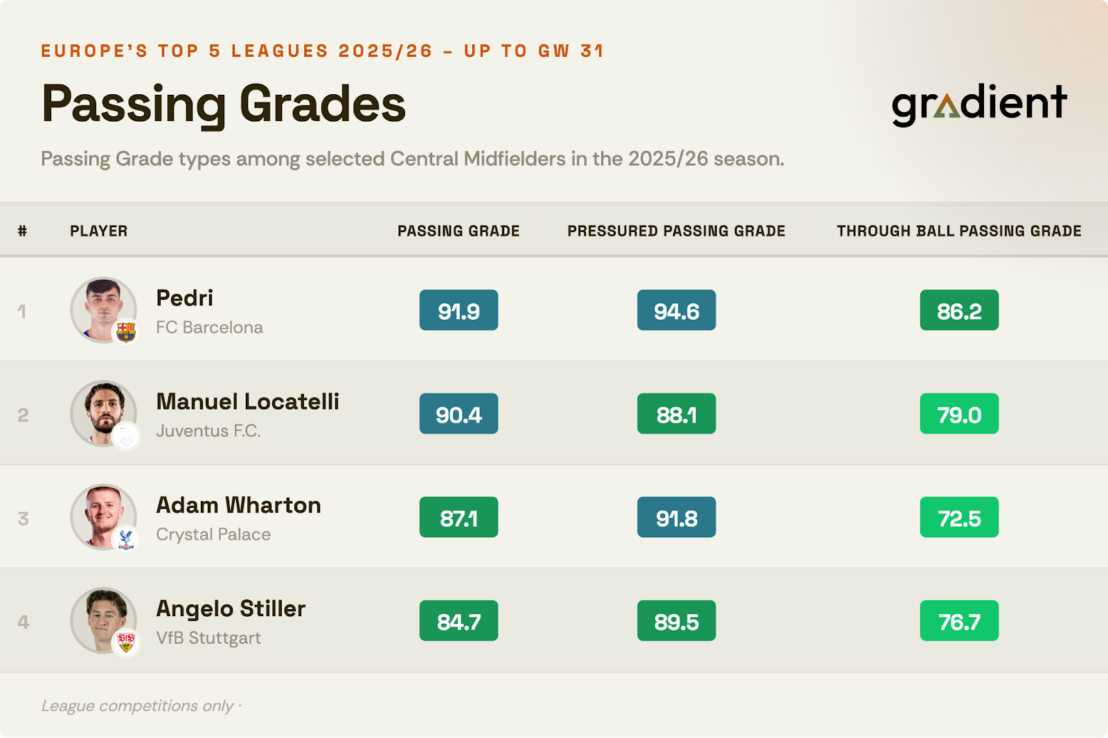 Gradient remains committed to refining and advancing its methodology. As part of that ongoing evolution, the data science team has recently updated the player grading process to strengthen cross-competition comparisons and introduce new grades that deliver even deeper insight into player performance.