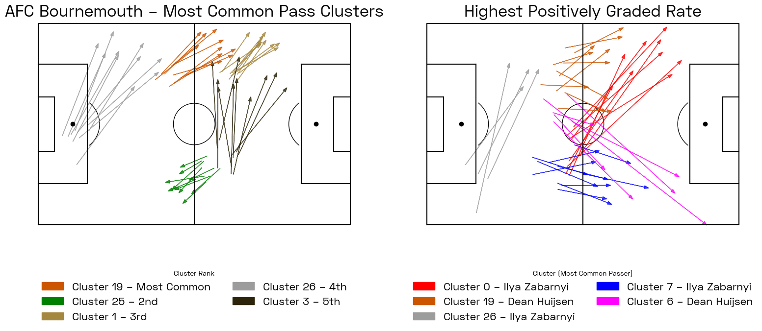 AFC Bournemouth is another interesting case to examine in regards to their passing profile, displaying a clear reliance on direct build-up play. Among all teams, they have the second longest average pass length (20.4 meters) across their five most frequently used clusters, trailing only Everton. This is evident in Figure 5, where most of their commonly used pass patterns, clusters 1, 3, 19 and 26 are longer range passes going towards the left flank. Interestingly, only one of these clusters (Cluster 19) overlaps with their five highest positively graded patterns. However, the positively graded clusters also reveal a similar direct approach, consisting of progressive passes from the backline into advanced areas. All of these high-difficulty passes are delivered by central defenders Ilya Zabarnyi and Dean Huijsen, suggesting a clear reliance on ball-playing center backs to initiate progression. With Huijsen completing a move to Real Madrid and Zabarnyi drawing interest in the transfer market, Bournemouth may face key structural questions heading into the season. If both are unavailable next season, Andoni Iraola will need to adjust his approach or identify defenders capable of consistently executing these difficult, line-breaking passes.