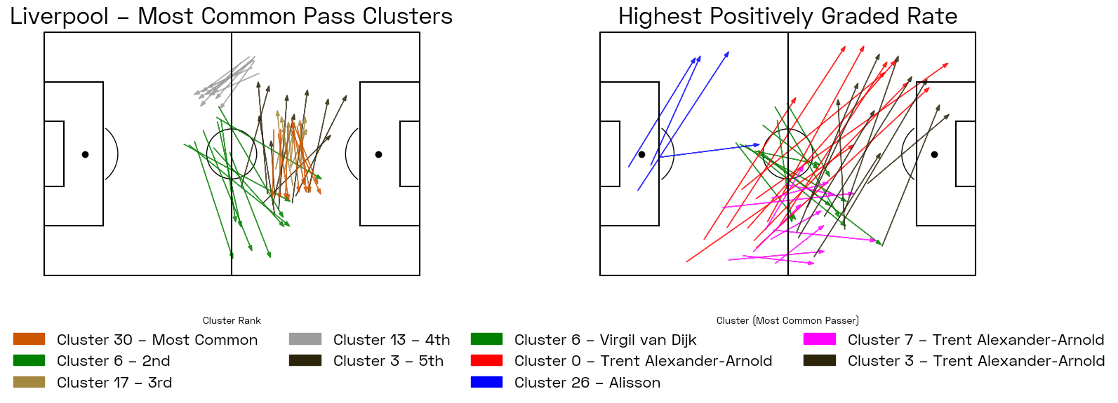 We also observe that many of these high-quality passes come from key playmakers in their build up. Virgil van Dijk is the most frequent passer in Cluster 6, while Trent Alexander-Arnold dominates Cluster 3. In fact, Alexander-Arnold appears as the top passer in three of Liverpool’s top five positively graded clusters, reinforcing his central role in the team’s buildup. With his departure and the arrival of Jeremie Frimpong, a different profile of full back, it will be interesting to monitor how Liverpool’s passing patterns evolve next season.